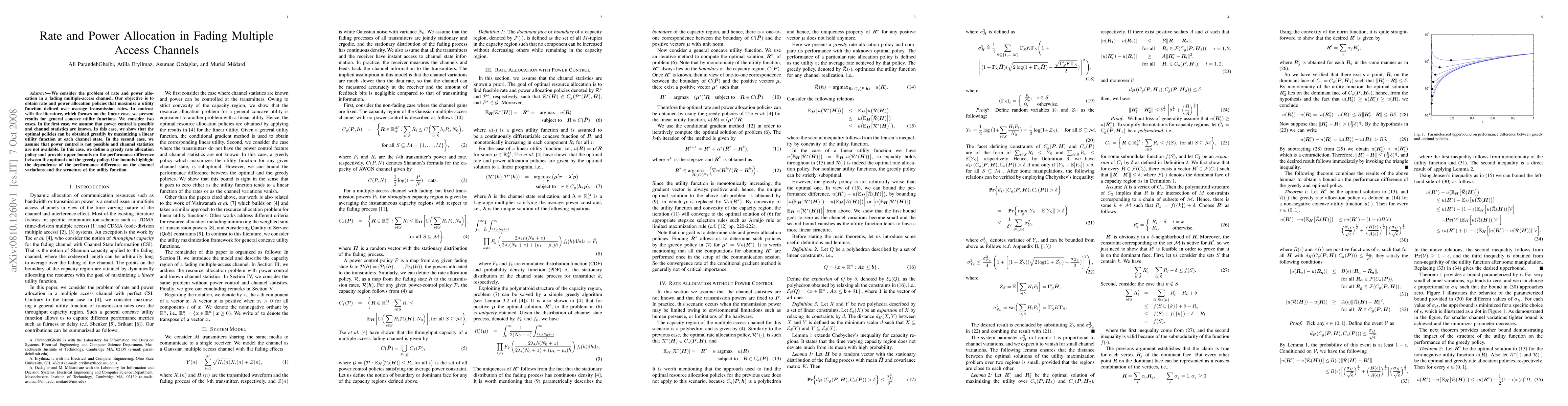 This paper investigates rate and power allocation strategies in fading multiple-access channels to maximize a utility function over average transmission rates, considering both scenarios with and without power control and known channel statistics. It presents optimal greedy policies for known channel conditions and provides performance bounds for scenarios without power control.