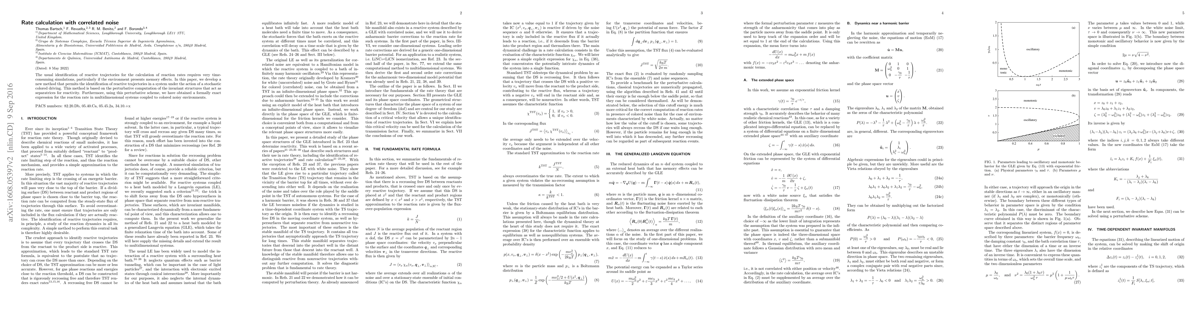 The usual identification of reactive trajectories for the calculation of reaction rates requires very time-consuming simulations, particularly if the environment presents memory effects. In this paper, we develop a new method that permits the identification of reactive trajectories in a system under the action of a stochastic colored driving. This method is based on the perturbative computation of the invariant structures that act as separatrices for reactivity. Furthermore, using this perturbative scheme, we have obtained a formally exact expression for the reaction rate in multidimensional systems coupled to colored noisy environments.