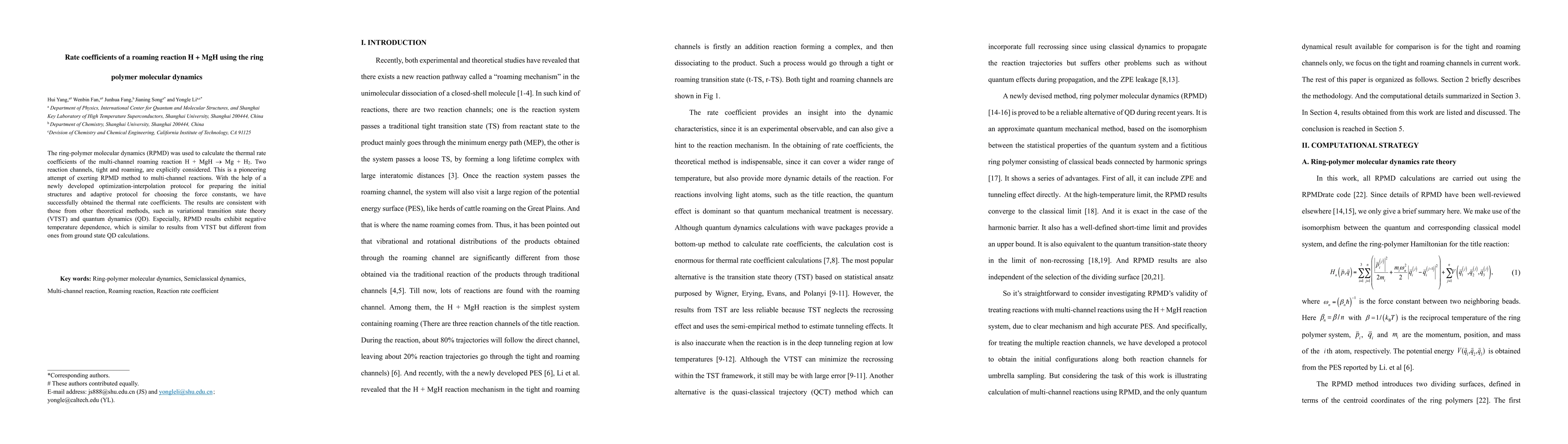 The ring-polymer molecular dynamics (RPMD) method was employed to calculate the thermal rate coefficients for the H + MgH roaming reaction, considering both tight and roaming pathways. This pioneering study reveals RPMD's applicability to multi-channel reactions, yielding results consistent with variational transition state theory and quantum dynamics, with a notable negative temperature dependence.