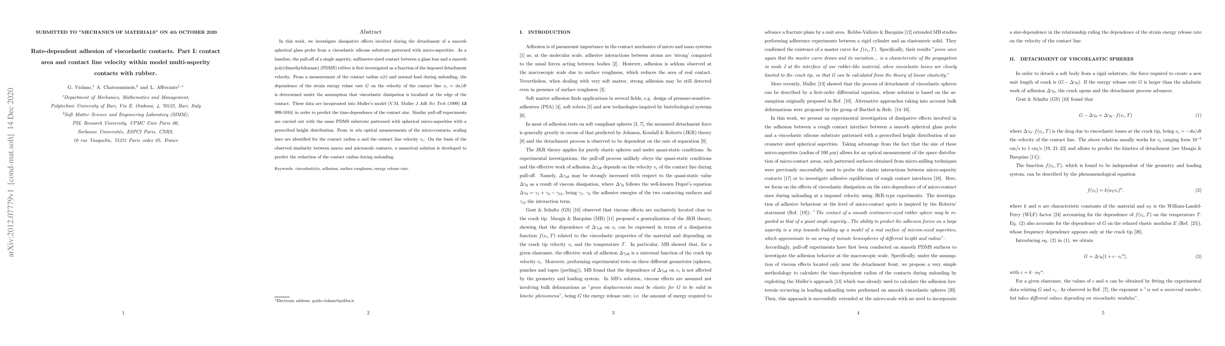 In this work, we investigate dissipative effects involved during the detachment of a smooth spherical glass probe from a viscoelastic silicone substrate patterned with micro-asperities. As a baseline, the pull-off of a single asperity, millimeter-sized contact between a glass lens and a smooth poly(dimethylsiloxane) (PDMS) rubber is first investigated as a function of the imposed detachment velocity. From a measurement of the contact radius a(t) and normal load during unloading, the dependence of the strain energy relase rate G on the velocity of the contact line vc = da/dt is determined under the assumption that viscoelastic dissipation is localized at the edge of the contact. These data are incorporated into Muller's model (V.M. Muller J Adh Sci Tech (1999) 13 999-1016) in order to predict the time-dependence of the contact size. Similar pull-off experiments are carried out with the same PDMS substrate patterned with spherical micro-asperities with a prescribed height distribution. From in situ optical measurements of the micro-contacts, scaling laws are identified for the contact radius a and the contact line velocity vc. On the basis of the observed similarity between macro and microscale contacts, a numerical solution is developed to predict the reduction of the contact radius during unloading.