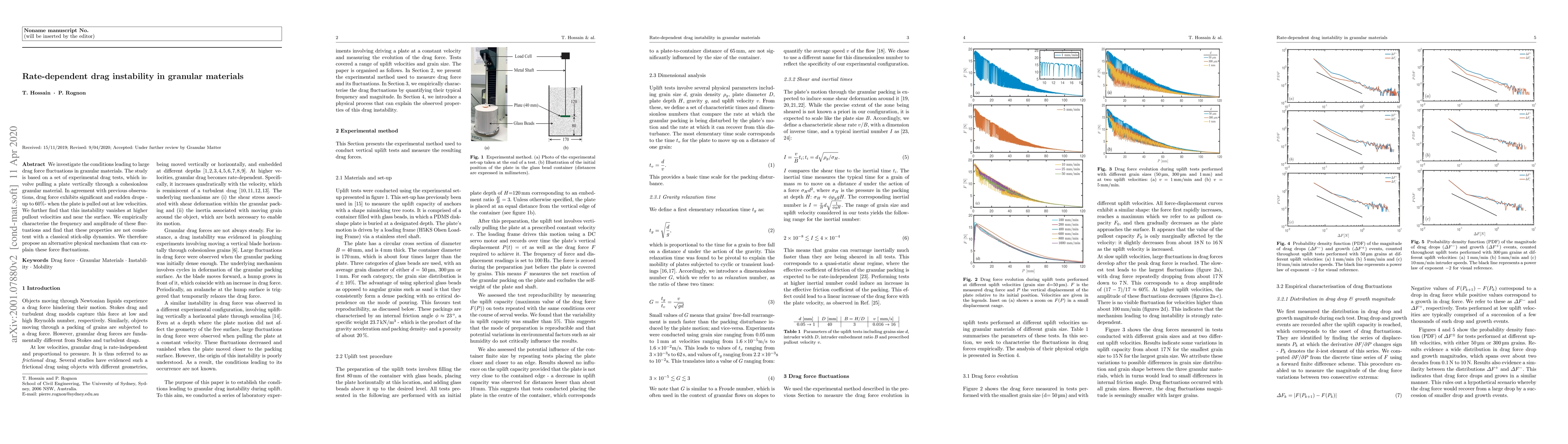 This paper investigates large drag force fluctuations in granular materials during vertical plate pullout, finding significant drops at low velocities that vanish at higher speeds. The observed instability does not align with classical stick-slip dynamics, suggesting an alternative physical mechanism for the force fluctuations.