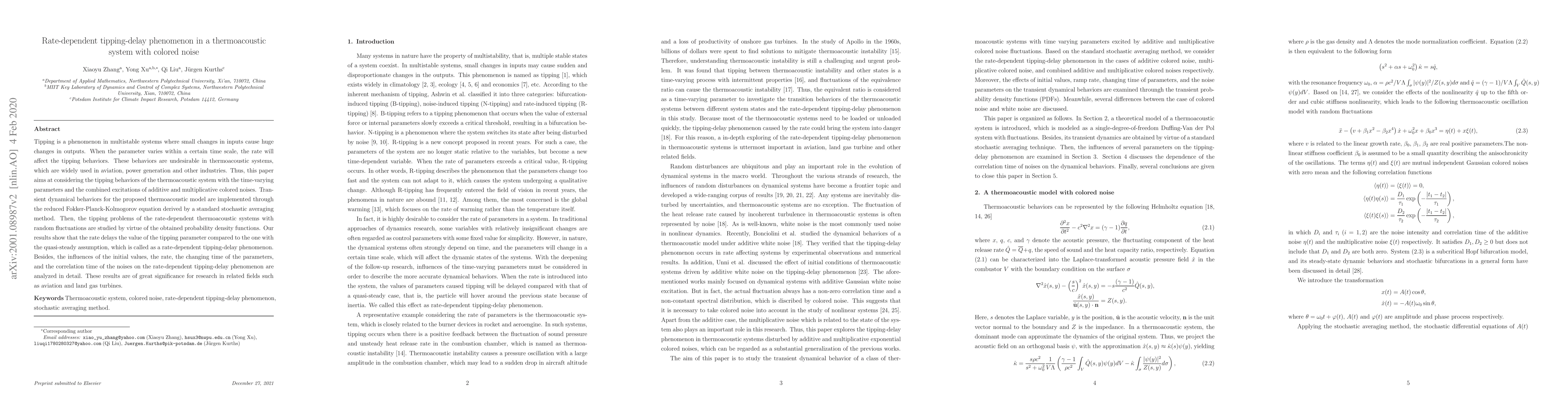 Tipping is a phenomenon in multistable systems where small changes in inputs cause huge changes in outputs. When the parameter varies within a certain time scale, the rate will affect the tipping behaviors. These behaviors are undesirable in thermoacoustic systems, which are widely used in aviation, power generation and other industries. Thus, this paper aims at considering the tipping behaviors of the thermoacoustic system with the time-varying parameters and the combined excitations of additive and multiplicative colored noises. Transient dynamical behaviors for the proposed thermoacoustic model are implemented through the reduced Fokker-Planck-Kolmogorov equation derived by a standard stochastic averaging method. Then, the tipping problems of the rate-dependent thermoacoustic systems with random fluctuations are studied by virtue of the obtained probability density functions. Our results show that the rate delays the value of the tipping parameter compared to the one with the quasi-steady assumption, which is called as a rate-dependent tipping-delay phenomenon. Besides, the influences of the initial values, the rate, the changing time of the parameters, and the correlation time of the noises on the rate-dependent tipping-delay phenomenon are analyzed in detail. These results are of great significance for research in related fields such as aviation and land gas turbines.