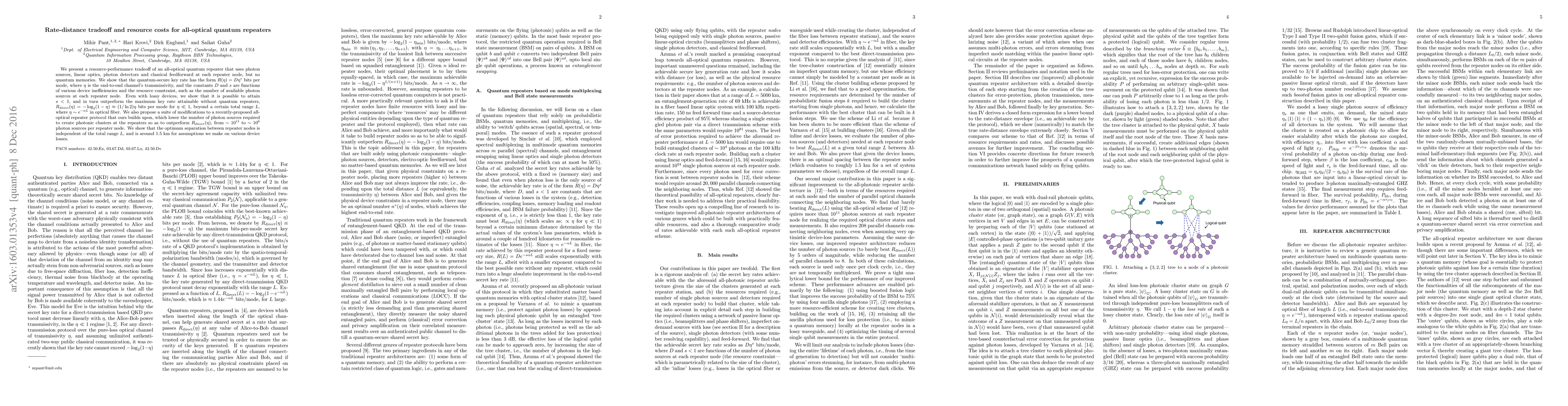 We present a resource-performance tradeoff of an all-optical quantum repeater that uses photon sources, linear optics, photon detectors and classical feedforward at each repeater node, but no quantum memories. We show that the quantum-secure key rate has the form $R(\eta) = D\eta^s$ bits per mode, where $\eta$ is the end-to-end channel's transmissivity, and the constants $D$ and $s$ are functions of various device inefficiencies and the resource constraint, such as the number of available photon sources at each repeater node. Even with lossy devices, we show that it is possible to attain $s < 1$, and in turn outperform the maximum key rate attainable without quantum repeaters, $R_{\rm direct}(\eta) = -\log_2(1-\eta) \approx (1/\ln 2)\eta$ bits per mode for $\eta \ll 1$, beyond a certain total range $L$, where $\eta \sim e^{-\alpha L}$ in optical fiber. We also propose a suite of modifications to a recently-proposed all-optical repeater protocol that ours builds upon, which lower the number of photon sources required to create photonic clusters at the repeaters so as to outperform $R_{\rm direct}(\eta)$, from $\sim 10^{11}$ to $\sim 10^{6}$ photon sources per repeater node. We show that the optimum separation between repeater nodes is independent of the total range $L$, and is around $1.5$ km for assumptions we make on various device losses.