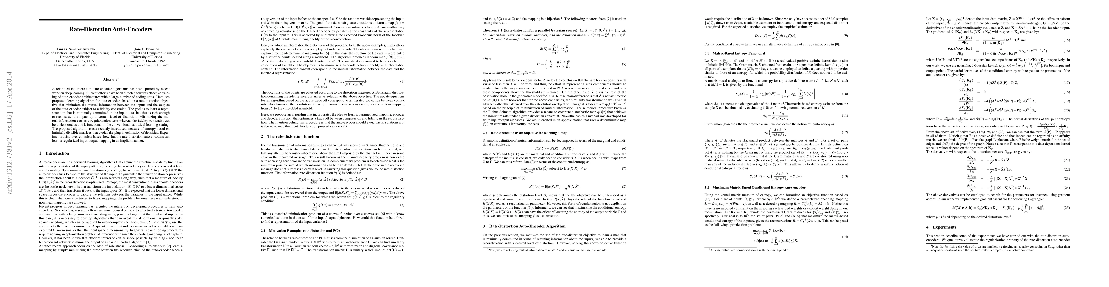 A rekindled the interest in auto-encoder algorithms has been spurred by recent work on deep learning. Current efforts have been directed towards effective training of auto-encoder architectures with a large number of coding units. Here, we propose a learning algorithm for auto-encoders based on a rate-distortion objective that minimizes the mutual information between the inputs and the outputs of the auto-encoder subject to a fidelity constraint. The goal is to learn a representation that is minimally committed to the input data, but that is rich enough to reconstruct the inputs up to certain level of distortion. Minimizing the mutual information acts as a regularization term whereas the fidelity constraint can be understood as a risk functional in the conventional statistical learning setting. The proposed algorithm uses a recently introduced measure of entropy based on infinitely divisible matrices that avoids the plug in estimation of densities. Experiments using over-complete bases show that the rate-distortion auto-encoders can learn a regularized input-output mapping in an implicit manner.