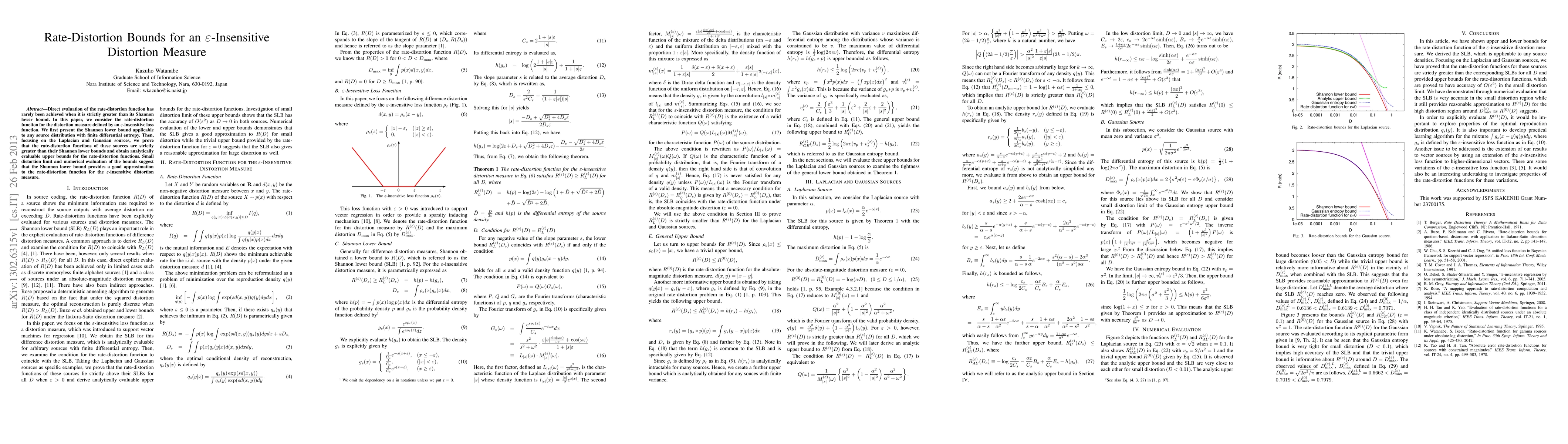 This paper investigates the rate-distortion function for an epsilon-insensitive distortion measure, proving that for Laplacian and Gaussian sources, the rate-distortion functions exceed their Shannon lower bounds, while providing analytically evaluable upper bounds. The study suggests that the Shannon lower bound closely approximates the actual rate-distortion function in the small distortion limit.