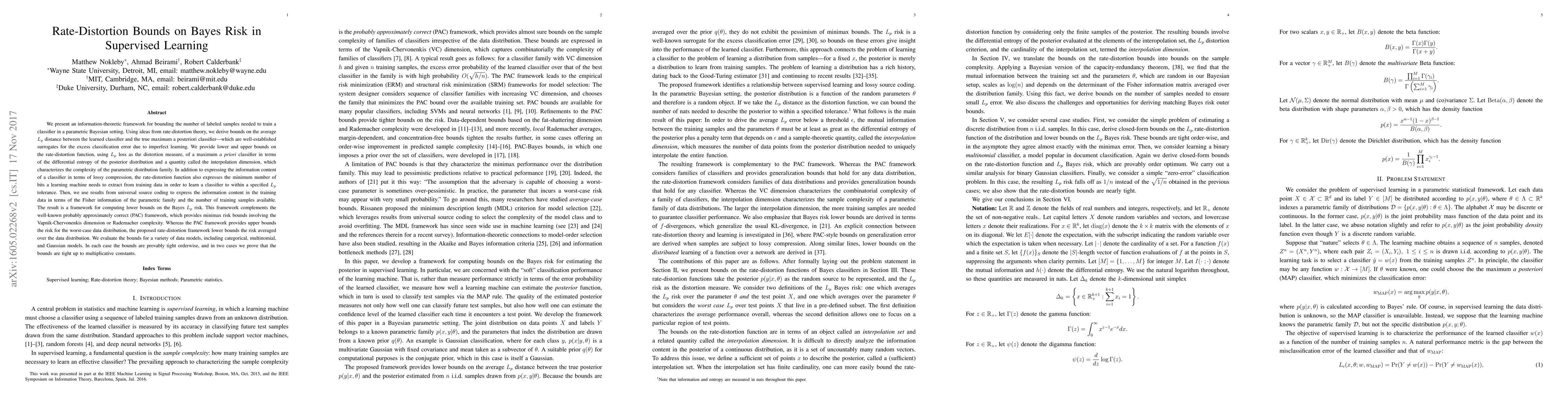 We present an information-theoretic framework for bounding the number of labeled samples needed to train a classifier in a parametric Bayesian setting. We derive bounds on the average $L_p$ distance between the learned classifier and the true maximum a posteriori classifier, which are well-established surrogates for the excess classification error due to imperfect learning. We provide lower and upper bounds on the rate-distortion function, using $L_p$ loss as the distortion measure, of a maximum a priori classifier in terms of the differential entropy of the posterior distribution and a quantity called the interpolation dimension, which characterizes the complexity of the parametric distribution family. In addition to expressing the information content of a classifier in terms of lossy compression, the rate-distortion function also expresses the minimum number of bits a learning machine needs to extract from training data to learn a classifier to within a specified $L_p$ tolerance. We use results from universal source coding to express the information content in the training data in terms of the Fisher information of the parametric family and the number of training samples available. The result is a framework for computing lower bounds on the Bayes $L_p$ risk. This framework complements the well-known probably approximately correct (PAC) framework, which provides minimax risk bounds involving the Vapnik-Chervonenkis dimension or Rademacher complexity. Whereas the PAC framework provides upper bounds the risk for the worst-case data distribution, the proposed rate-distortion framework lower bounds the risk averaged over the data distribution. We evaluate the bounds for a variety of data models, including categorical, multinomial, and Gaussian models. In each case the bounds are provably tight orderwise, and in two cases we prove that the bounds are tight up to multiplicative constants.