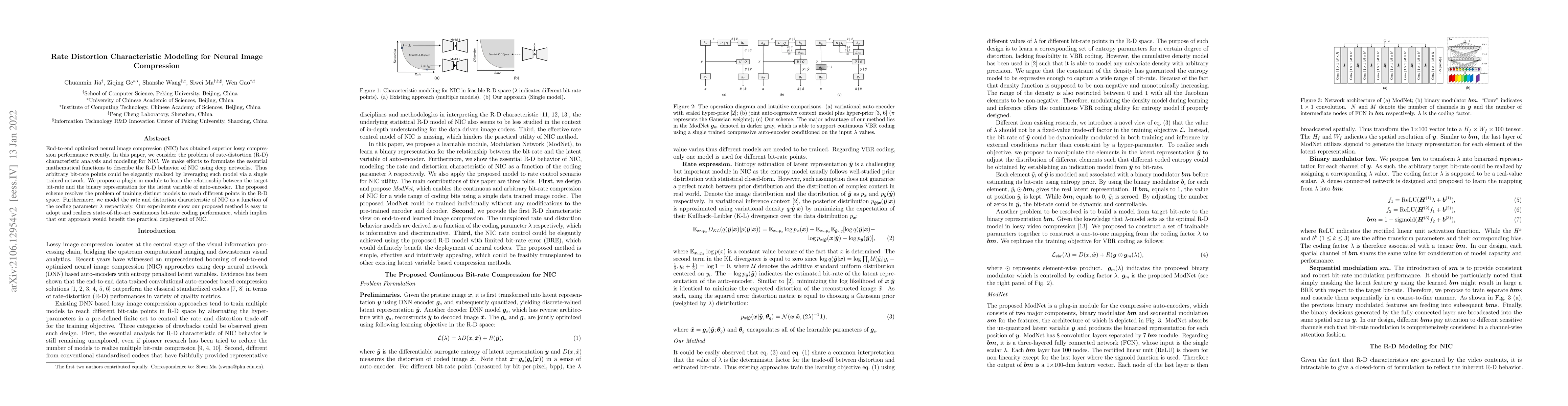 This paper proposes a mathematical framework to model the rate-distortion characteristics of neural image compression using deep networks, enabling efficient bit-rate adjustments through a single trained network. The method introduces a plugin module to learn the relationship between bit-rate and latent variable representation, achieving state-of-the-art performance in continuous bit-rate coding.