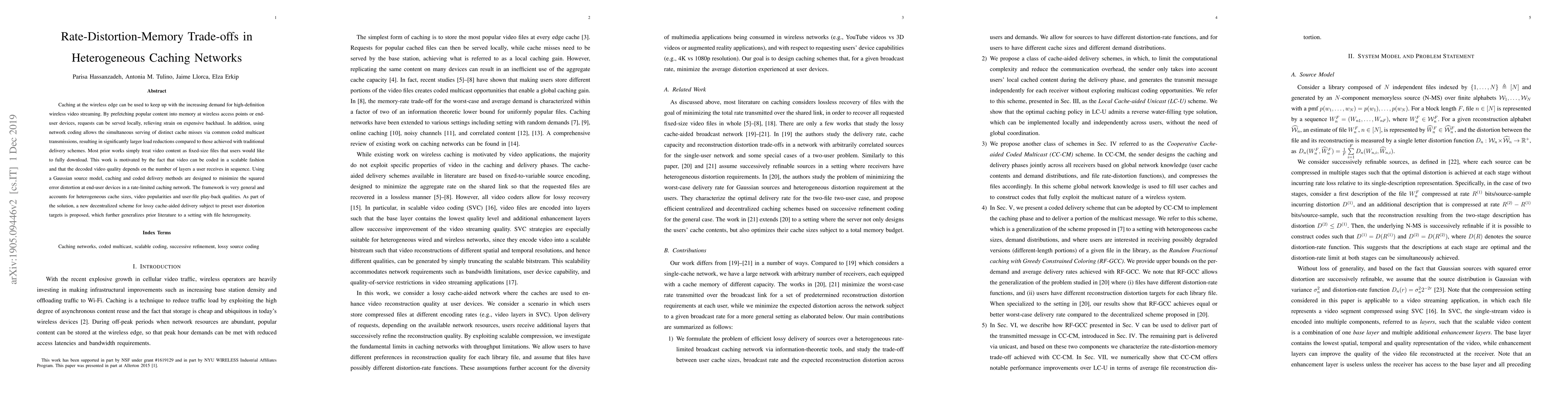 This paper explores rate-distortion-memory trade-offs in heterogeneous caching networks for high-definition video streaming, proposing a decentralized scheme for lossy cache-aided delivery that minimizes squared error distortion while accounting for varying cache sizes and user playback qualities. The approach leverages scalable video coding and network coding to optimize load reductions and relieve backhaul strain.