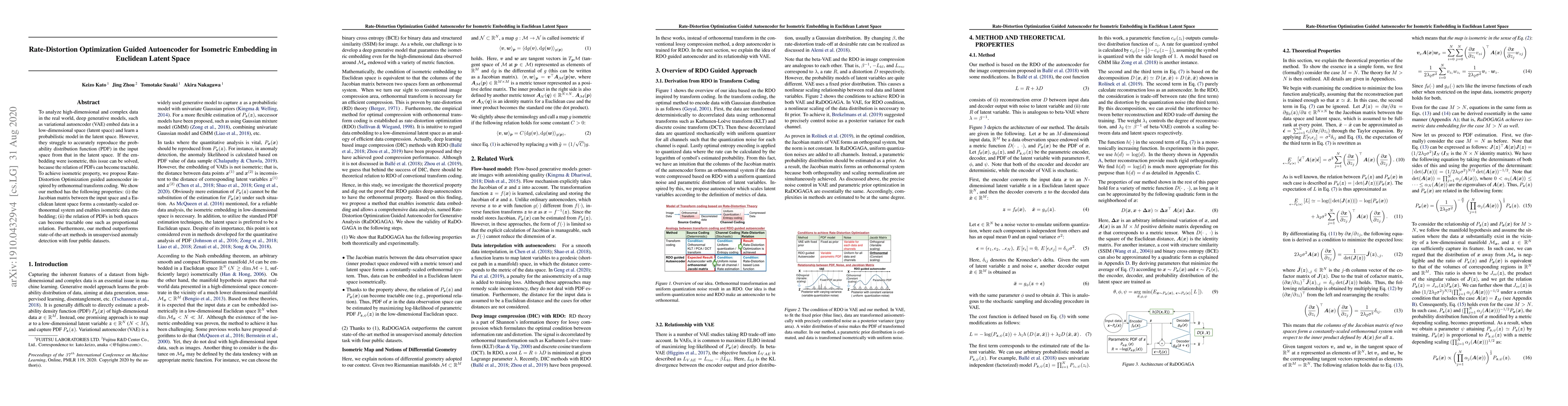 This paper proposes a Rate-Distortion Optimization guided autoencoder to achieve isometric embedding in Euclidean latent space, ensuring accurate reproduction of probability distributions. The method enables tractable relations between PDFs and outperforms state-of-the-art in unsupervised anomaly detection.