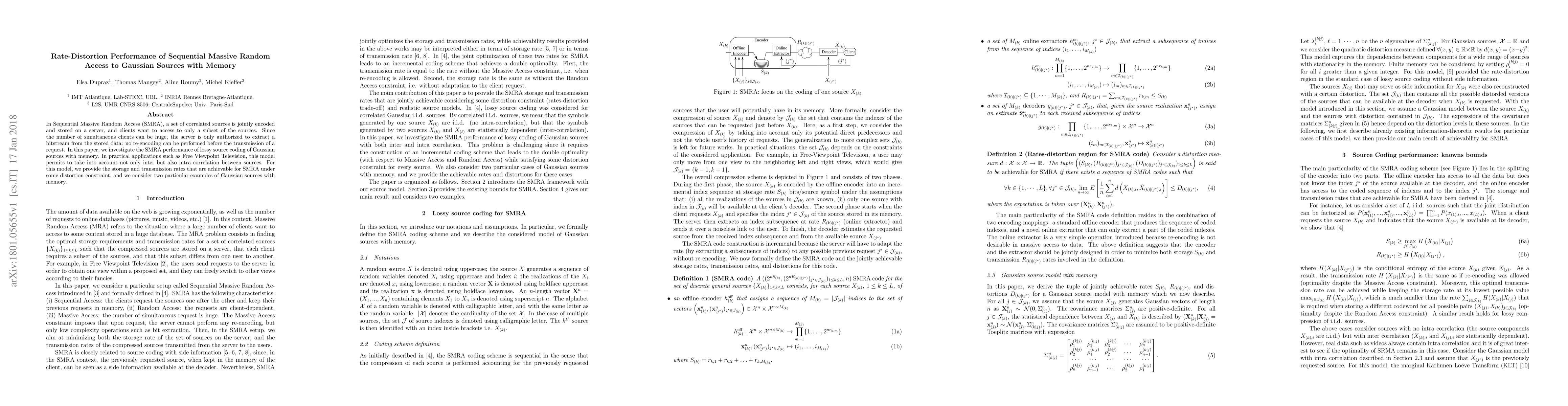 This paper investigates the rate-distortion performance of Sequential Massive Random Access (SMRA) for Gaussian sources with memory, focusing on scenarios where clients access subsets of correlated sources without re-encoding. It provides achievable storage and transmission rates under distortion constraints, with applications to Free Viewpoint Television.