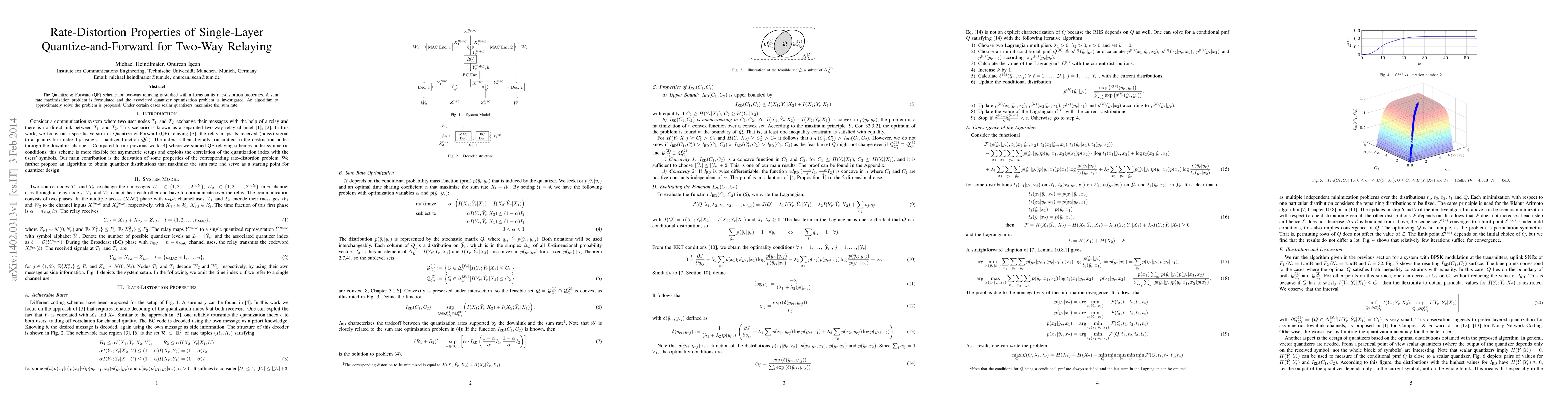 This paper investigates the rate-distortion properties of the Single-Layer Quantize & Forward scheme in two-way relaying, formulating a sum rate maximization problem and proposing an algorithm to solve it. It finds that scalar quantizers can maximize the sum rate under certain conditions.