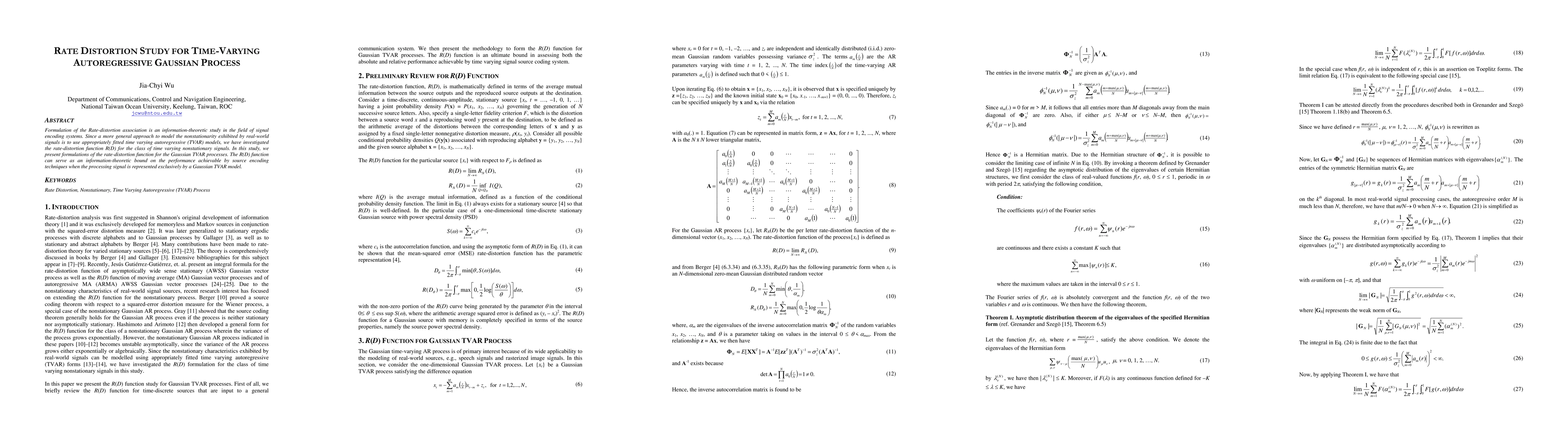 Rate-distortion formulation is the information-theoretic approach to the study of signal encoding systems. Since a more general approach to model the nonstationarity exhibited by real-world signals is to use appropriately fitted time varying autoregressive (TVAR) models, we have investigated the rate-distortion function for the class of time varying nonstationary signals. In this study, we present formulations of the rate-distortion function for the Gaussian TVAR processes. The rate-distortion function can serve as an information-theoretic bound on the performance achievable by source encoding techniques when the processing signal is represented exclusively by a Gaussian TVAR model.