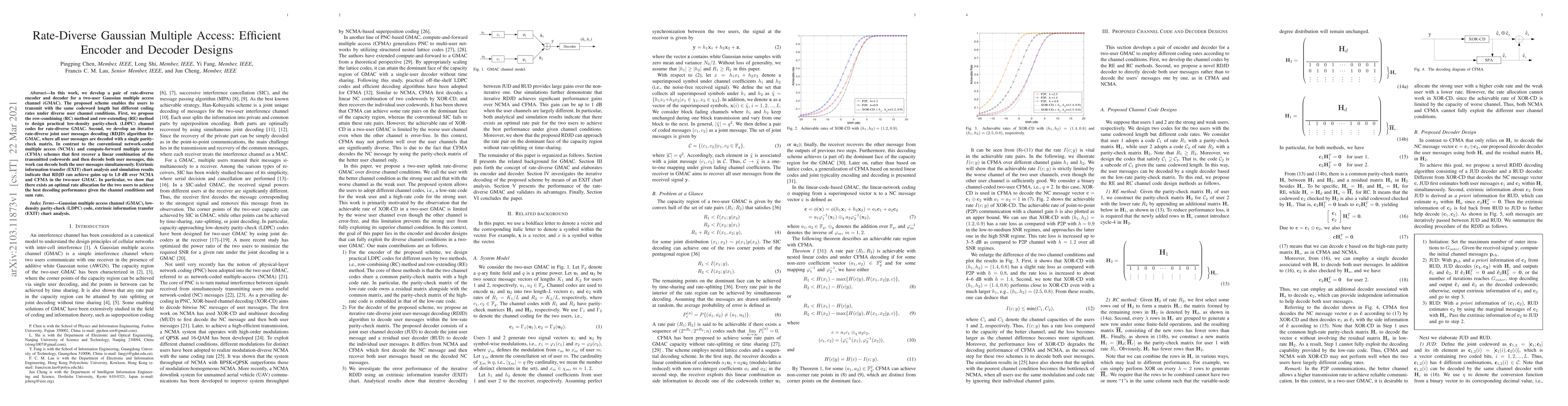 In this work, we develop a pair of rate-diverse encoder and decoder for a two-user Gaussian multiple access channel (GMAC). The proposed scheme enables the users to transmit with the same codeword length but different coding rates under diverse user channel conditions. First, we propose the row-combining (RC) method and row-extending (RE) method to design practical low-density parity-check (LDPC) channel codes for rate-diverse GMAC. Second, we develop an iterative rate-diverse joint user messages decoding (RDJD) algorithm for GMAC, where all user messages are decoded with a single parity-check matrix. In contrast to the conventional network-coded multiple access (NCMA) and compute-forward multiple access (CFMA) schemes that first recover a linear combination of the transmitted codewords and then decode both user messages, this work can decode both the user messages simultaneously. Extrinsic information transfer (EXIT) chart analysis and simulation results indicate that RDJD can achieve gains up to 1.0 dB over NCMA and CFMA in the two-user GMAC. In particular, we show that there exists an optimal rate allocation for the two users to achieve the best decoding performance given the channel conditions and sum rate.