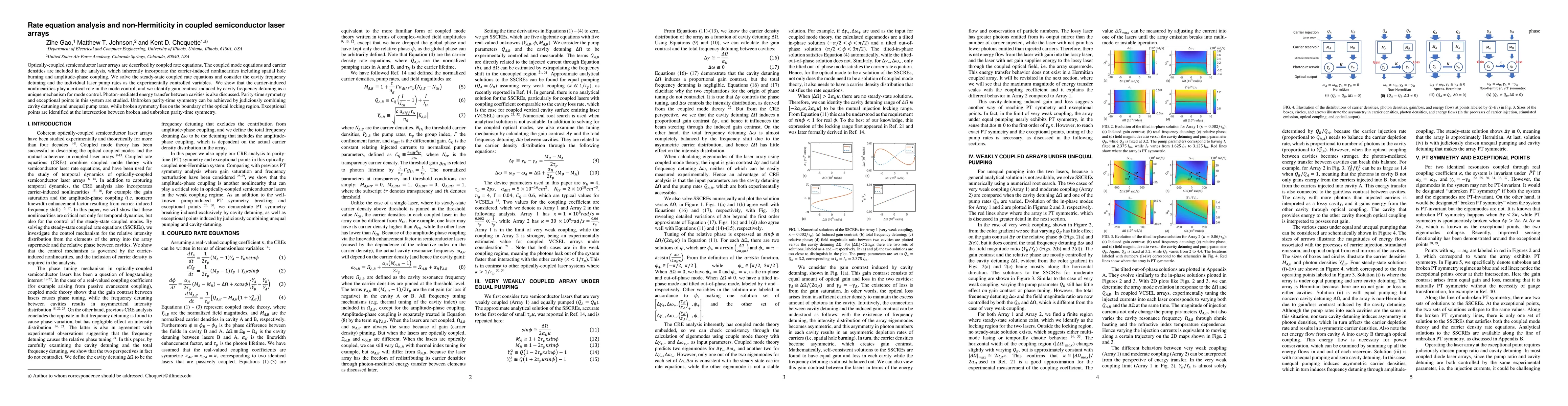This paper analyzes coupled semiconductor laser arrays using rate equations, focusing on carrier-induced nonlinearities and their impact on mode control. It explores parity-time symmetry and exceptional points, demonstrating that cavity frequency detuning and unequal pump rates can achieve unbroken symmetry, while broken symmetry occurs near the optical locking boundary, with exceptional points at the intersection of these symmetries.