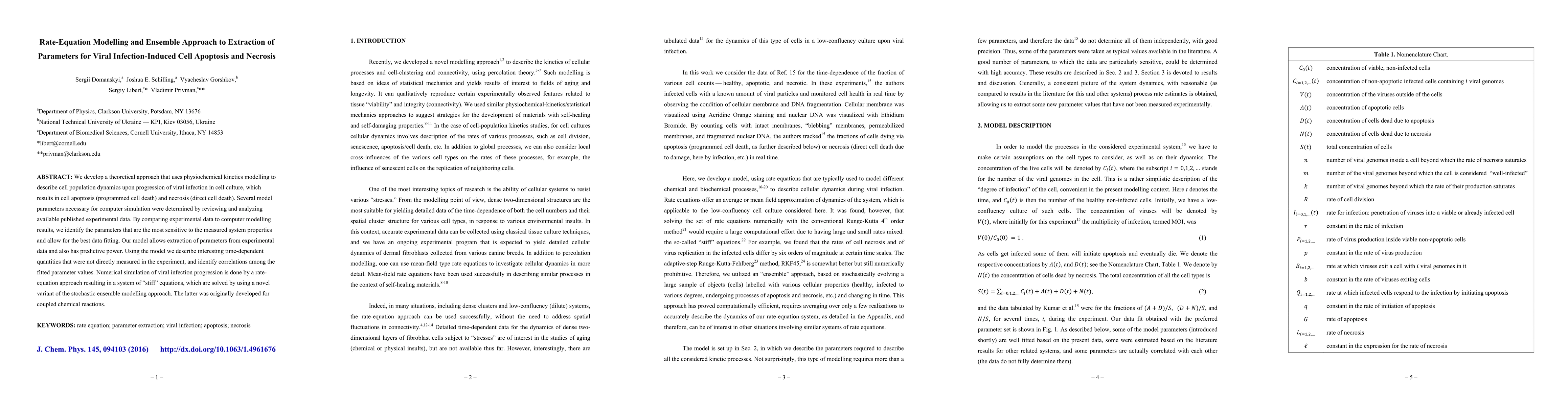 This paper develops a theoretical model using physiochemical kinetics to simulate viral infection-induced cell apoptosis and necrosis, extracting key parameters from experimental data and identifying sensitive parameters for best data fitting. The model employs a rate-equation approach and a novel stochastic ensemble method for numerical simulation, providing predictive insights and identifying correlations among parameter values.