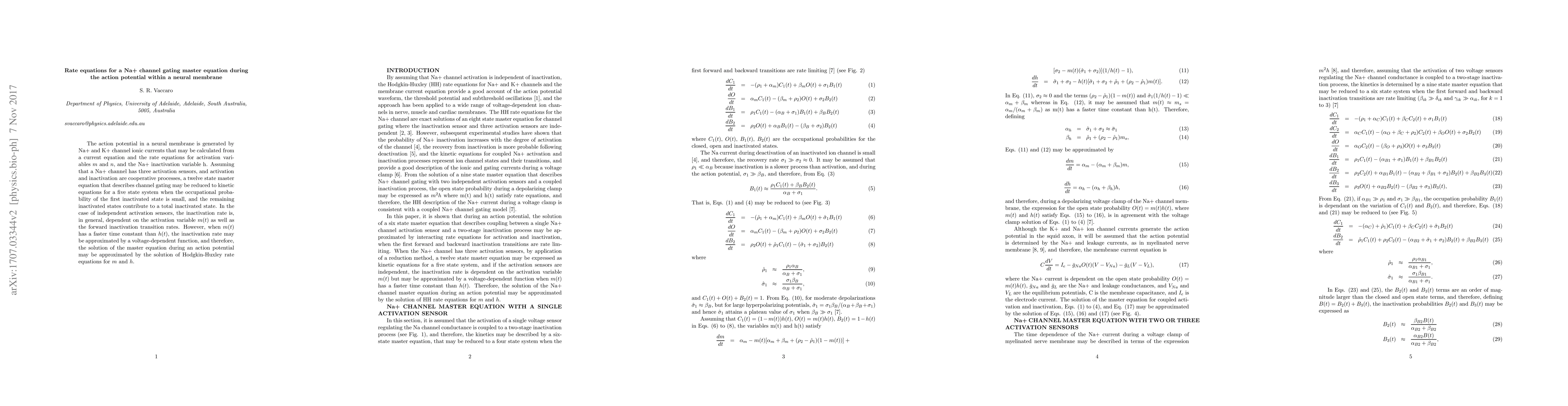 The action potential in a neural membrane is generated by Na+ and K+ channel ionic currents that may be calculated from a current equation and the rate equations for activation variables m and n, and the Na+ inactivation variable h. Assuming that a Na+ channel has three activation sensors, and activation and inactivation are cooperative processes, a twelve state master equation that describes channel gating may be reduced to kinetic equations for a five state system when the occupational probability of the first inactivated state is small, and the remaining inactivated states contribute to a total inactivated state. In the case of independent activation sensors, the inactivation rate is, in general, dependent on the activation variable m(t) as well as the forward inactivation transition rates. However, when m(t) has a faster time constant than h(t), the inactivation rate may be approximated by a voltage-dependent function, and therefore, the solution of the master equation during an action potential may be approximated by the solution of Hodgkin-Huxley rate equations for m and h.