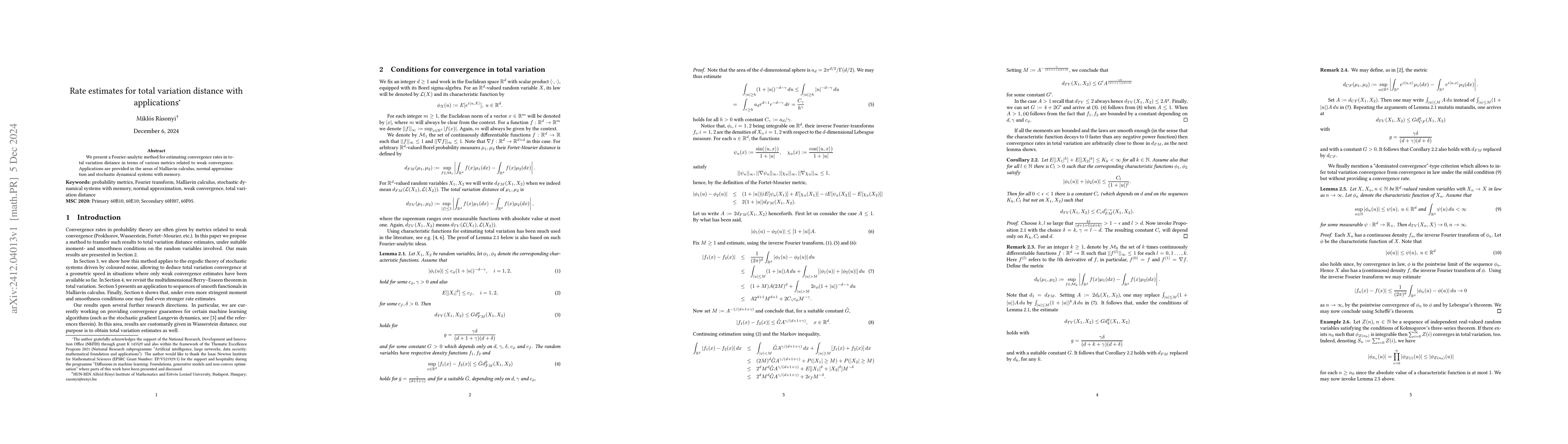 This paper introduces a Fourier-analytic approach to estimate convergence rates in total variation distance, connecting these rates to metrics of weak convergence. The method is applied to Malliavin calculus, normal approximation, and stochastic dynamical systems with memory.