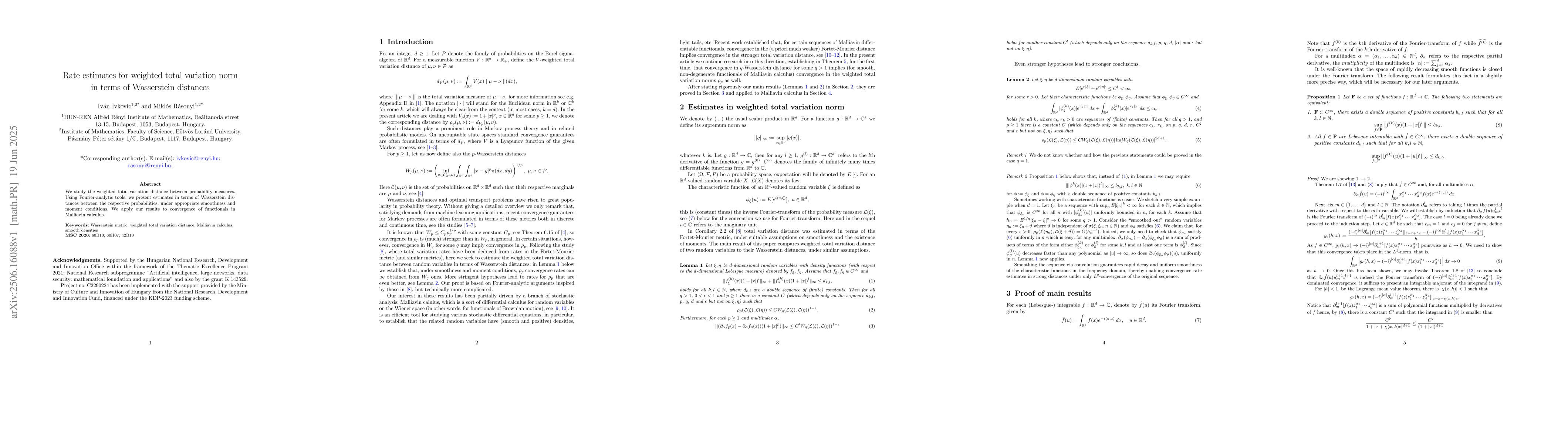 We study the weighted total variation distance between probability measures. Using Fourier-analytic tools, we present estimates in terms of Wasserstein distances between the respective probabilities, under appropriate smoothness and moment conditions. We apply our results to convergence of functionals in Malliavin calculus.