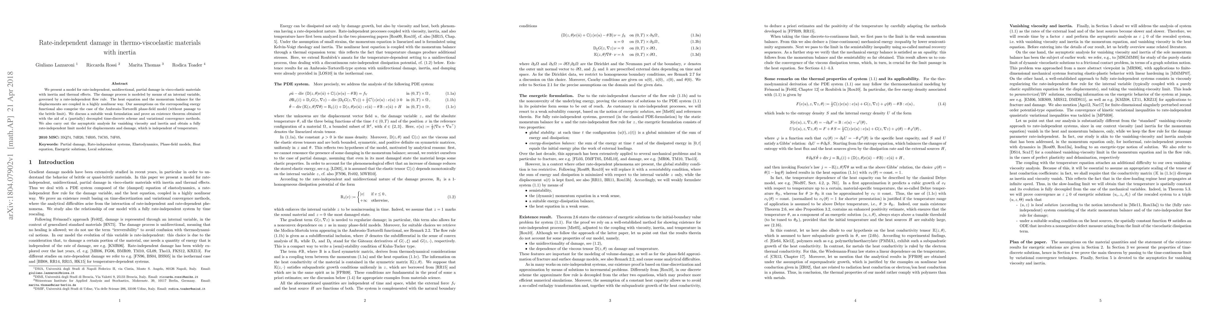 We present a model for rate-independent, unidirectional, partial damage in visco-elastic materials with inertia and thermal effects. The damage process is modeled by means of an internal variable, governed by a rate-independent flow rule. The heat equation and the momentum balance for the displacements are coupled in a highly nonlinear way. Our assumptions on the corresponding energy functional also comprise the case of the Ambrosio-Tortorelli phase-field model (without passage to the brittle limit). We discuss a suitable weak formulation and prove an existence theorem obtained with the aid of a (partially) decoupled time-discrete scheme and variational convergence methods. We also carry out the asymptotic analysis for vanishing viscosity and inertia and obtain a fully rate-independent limit model for displacements and damage, which is independent of temperature.