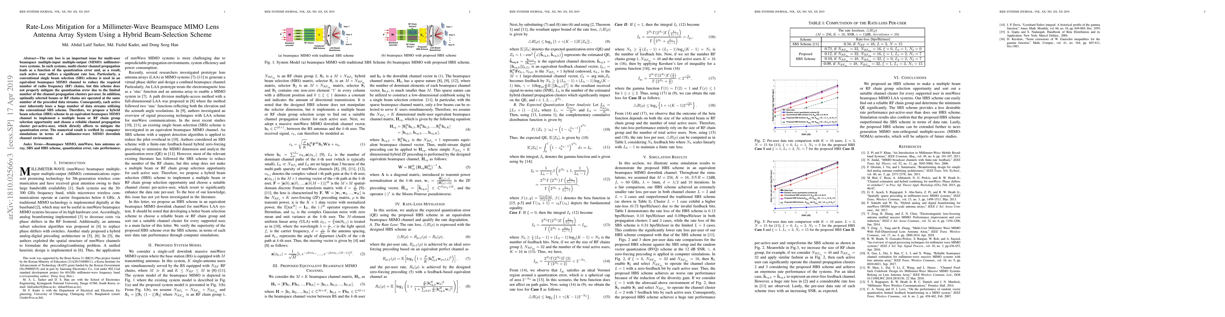 The rate loss is an important issue for multi-user beamspace multiple-input multiple-output (MIMO) millimeter-wave systems. In such systems, multi-cluster channel propagation leads as a function of the quantization error and, as a result, each active user suffers a significant rate loss. Particularly, a conventional single beam selection (SBS) scheme is used in an equivalent beamspace MIMO channel to reduce the required number of radio frequency (RF) chains, but this scheme does not properly mitigate the quantization error due to the limited number of the channel propagation clusters per-user. In addition, optimally selected beams or RF chains are operated at the same number of the precoded data streams. Consequently, each active user inherently loses a huge number of data streams utilizing the conventional SBS scheme. Therefore, we propose a hybrid beam selection (HBS) scheme in an equivalent beamspace MIMO channel to implement a multiple beam or RF chain group selection opportunity and choose a reliable channel propagation cluster per-active-user, which directly affects to mitigate the quantization error. The numerical result is verified by computer simulations in terms of a millimeter-wave MIMO downlink channel environment.