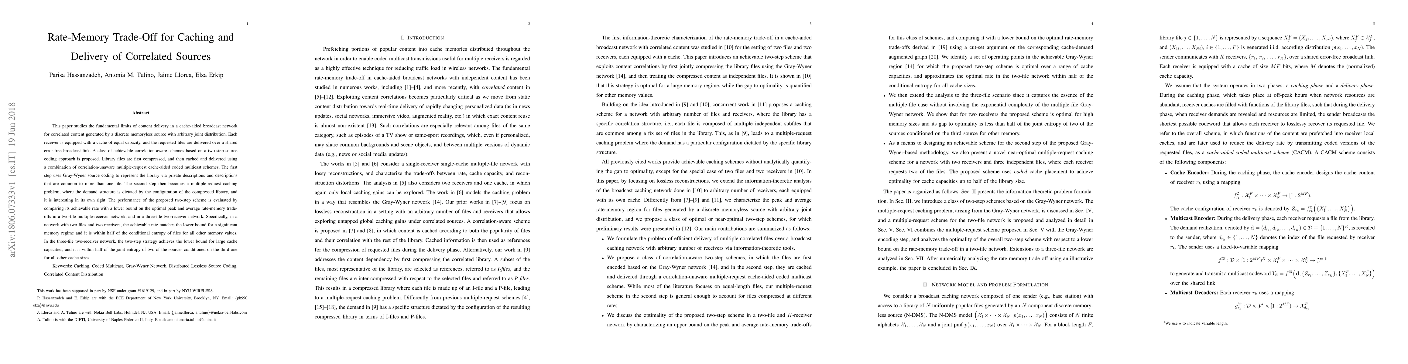 This paper studies the fundamental limits of content delivery in a cache-aided broadcast network for correlated content generated by a discrete memoryless source with arbitrary joint distribution. Each receiver is equipped with a cache of equal capacity, and the requested files are delivered over a shared error-free broadcast link. A class of achievable correlation-aware schemes based on a two-step source coding approach is proposed. Library files are first compressed, and then cached and delivered using a combination of correlation-unaware multiple-request cache-aided coded multicast schemes. The first step uses Gray-Wyner source coding to represent the library via private descriptions and descriptions that are common to more than one file. The second step then becomes a multiple-request caching problem, where the demand structure is dictated by the configuration of the compressed library, and it is interesting in its own right. The performance of the proposed two-step scheme is evaluated by comparing its achievable rate with a lower bound on the optimal peak and average rate-memory tradeoffs in a two-file multiple-receiver network, and in a three-file two-receiver network. Specifically, in a network with two files and two receivers, the achievable rate matches the lower bound for a significant memory regime and it is within half of the conditional entropy of files for all other memory values. In the three-file two-receiver network, the two-step strategy achieves the lower bound for large cache capacities, and it is within half of the joint entropy of two of the sources conditioned on the third one for all other cache sizes.