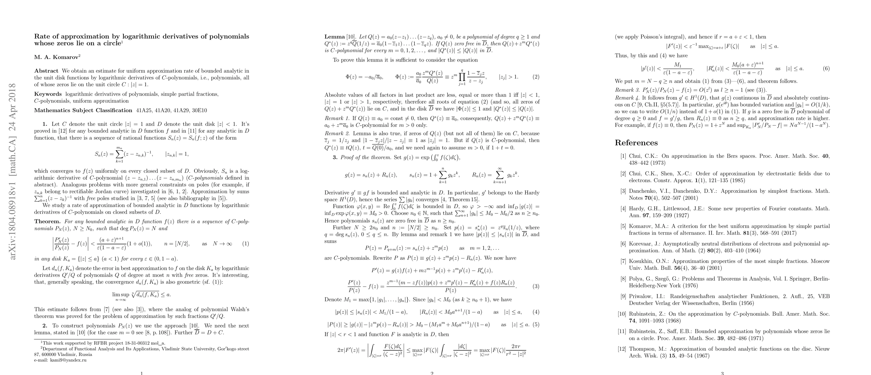 We obtain an estimate for uniform approximation rate of bounded analytic in the unit disk functions by logarithmic derivatives of $C$-polynomials, i.e., polynomials, all of whose zeros lie on the unit circle $C:|z|=1$.