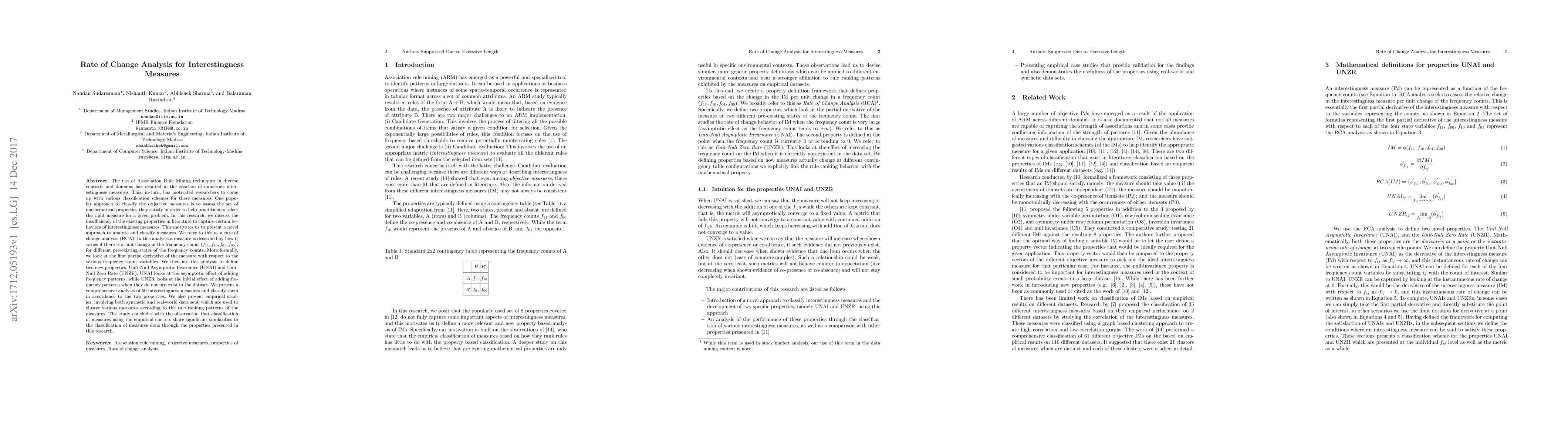 This paper introduces a novel rate of change analysis (RCA) to classify interestingness measures in Association Rule Mining, proposing two new properties: Unit-Null Asymptotic Invariance (UNAI) and Unit-Null Zero Rate (UNZR). The study analyzes 50 measures and finds that empirical clustering aligns well with the new classification framework.