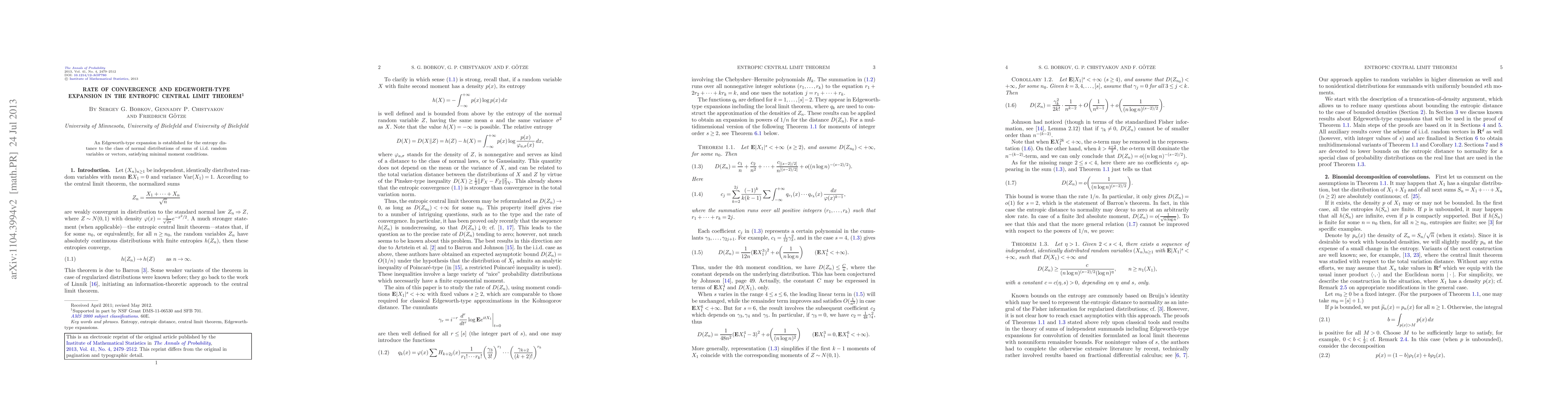Summary: This paper presents an Edgeworth-type expansion for the entropy distance to normal distributions in the central limit theorem, focusing on sums of independent and identically distributed random variables or vectors under minimal moment conditions. The expansion provides insights into the rate of convergence.