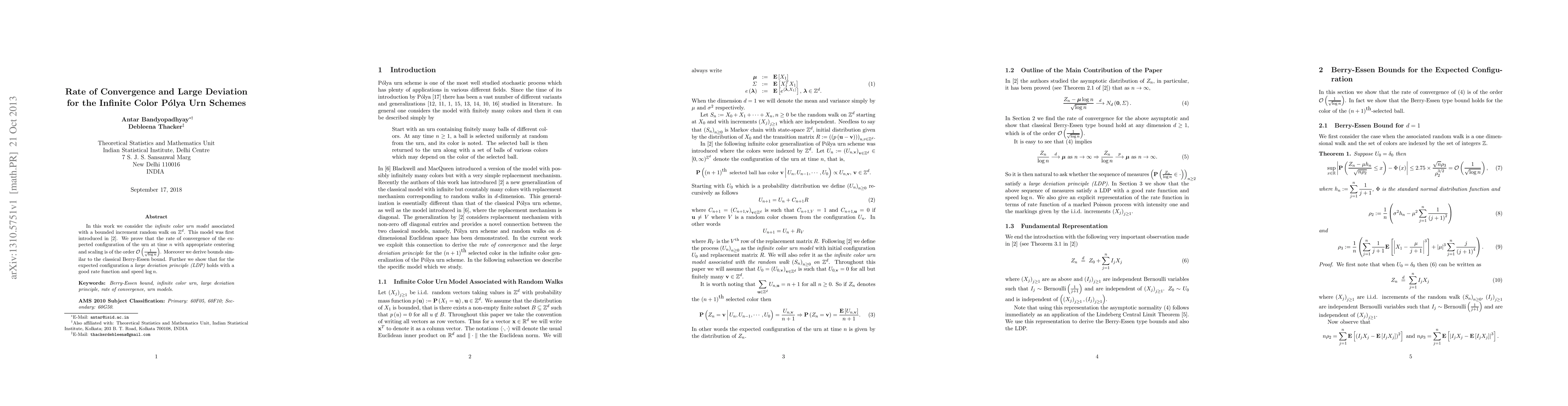 In this work we consider the \emph{infinite color urn model} associated with a bounded increment random walk on $\Zbold^d$. This model was first introduced by Bandyopadhyay and Thacker (2013). We prove that the rate of convergence of the expected configuration of the urn at time $n$ with appropriate centering and scaling is of the order ${\mathcal O}\left(\frac{1}{\sqrt{\log n}}\right)$. Moreover we derive bounds similar to the classical Berry-Essen bound. Further we show that for the expected configuration a \emph{large deviation principle (LDP)} holds with a good rate function and speed $\log n$.