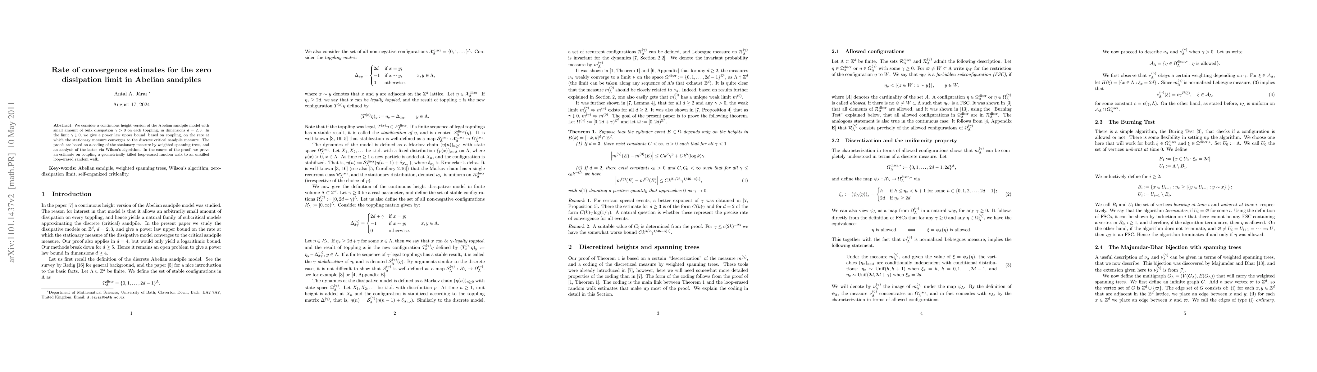 This paper studies the convergence rate of a continuous Abelian sandpile model with small dissipation to its critical stationary measure as dissipation approaches zero. The authors provide a power law upper bound for this convergence rate, leveraging a coupling argument and analysis of weighted spanning trees via Wilson's algorithm.