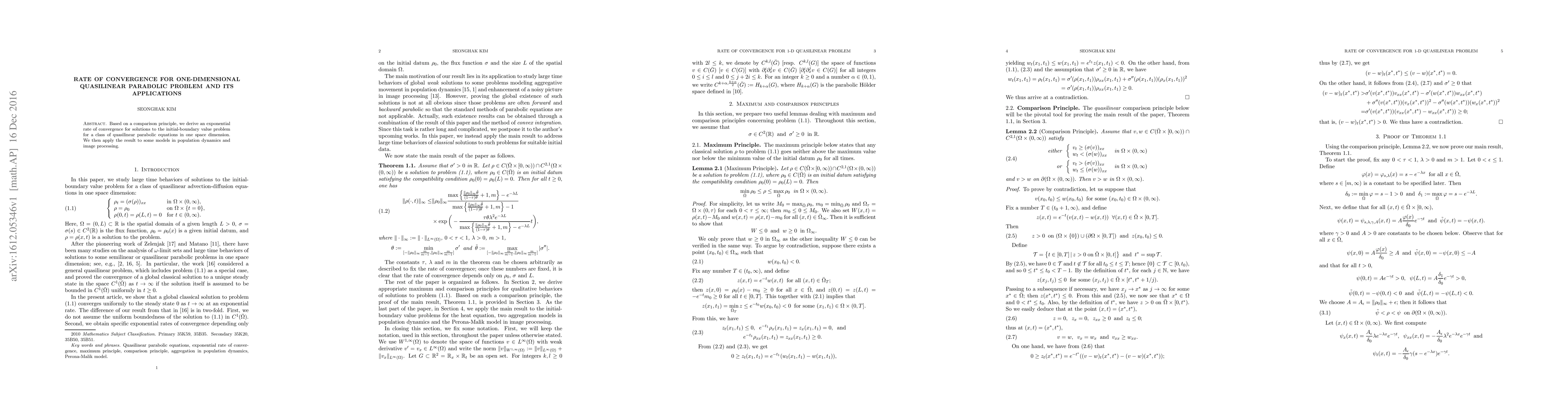 Researchers found an exponential rate of convergence for solutions to quasilinear parabolic equations in one dimension, with applications in population dynamics and image processing.