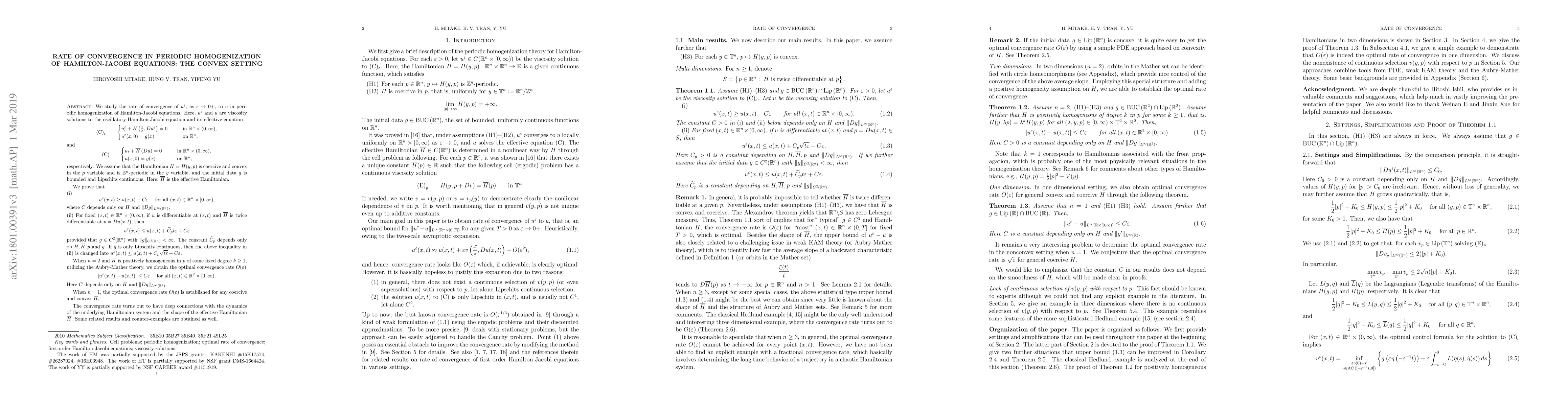 We study the rate of convergence of $u^\epsilon$, as $\epsilon \to 0+$, to $u$ in periodic homogenization of Hamilton-Jacobi equations. Here, $u^\epsilon$ and $u$ are viscosity solutions to the oscillatory Hamilton-Jacobi equation and its effective equation \begin{equation*} {\rm (C)_\epsilon} \qquad \begin{cases} u_t^\epsilon+H\left(\frac{x}{\epsilon},Du^\epsilon\right)=0 \qquad &\text{in} \ \mathbb{R}^n \times (0,\infty), u^\epsilon(x,0)=g(x) \qquad &\text{on} \ \mathbb{R}^n, \end{cases} \end{equation*} and \begin{equation*} {\rm (C)} \qquad \begin{cases} u_t+\overline{H}\left(Du\right)=0 \qquad &\text{in} \ \mathbb{R}^n \times (0,\infty), u(x,0)=g(x) \qquad &\text{on} \ \mathbb{R}^n, \end{cases} \end{equation*} respectively. We assume that the Hamiltonian $H=H(y,p)$ is coercive and convex in the $p$ variable and is $\mathbb{Z}^n$-periodic in the $y$ variable, and the initial data $g$ is bounded and Lipschitz continuous.