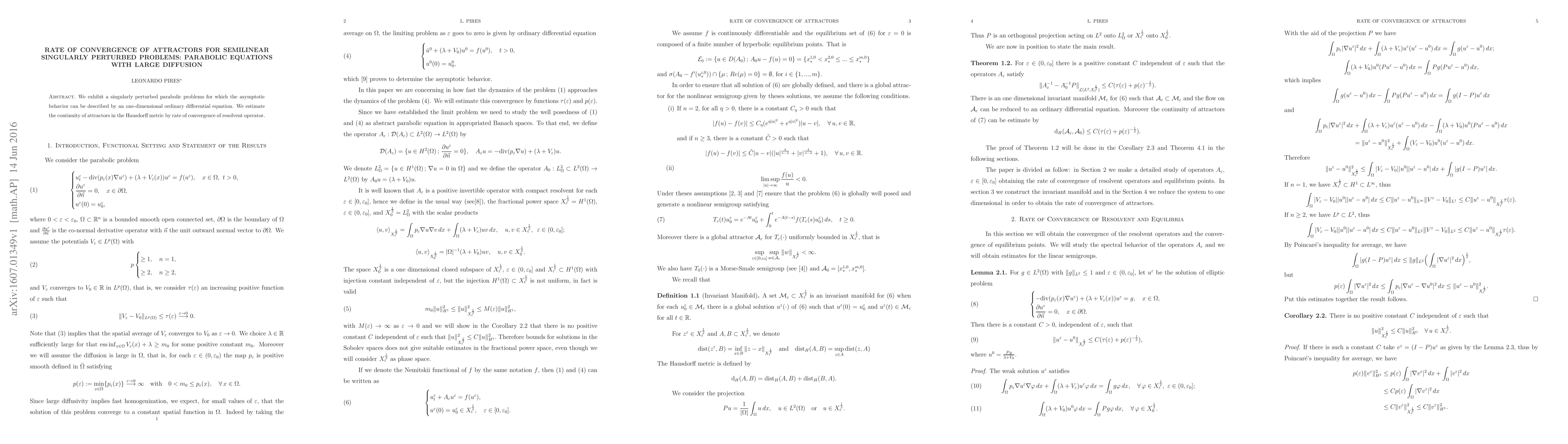 This paper investigates the rate of convergence of attractors for singularly perturbed parabolic equations with large diffusion. The authors demonstrate that the asymptotic behavior of these problems can be captured by a one-dimensional ordinary differential equation and estimate the continuity of attractors using the convergence rate of the resolvent operator in the Hausdorff metric.