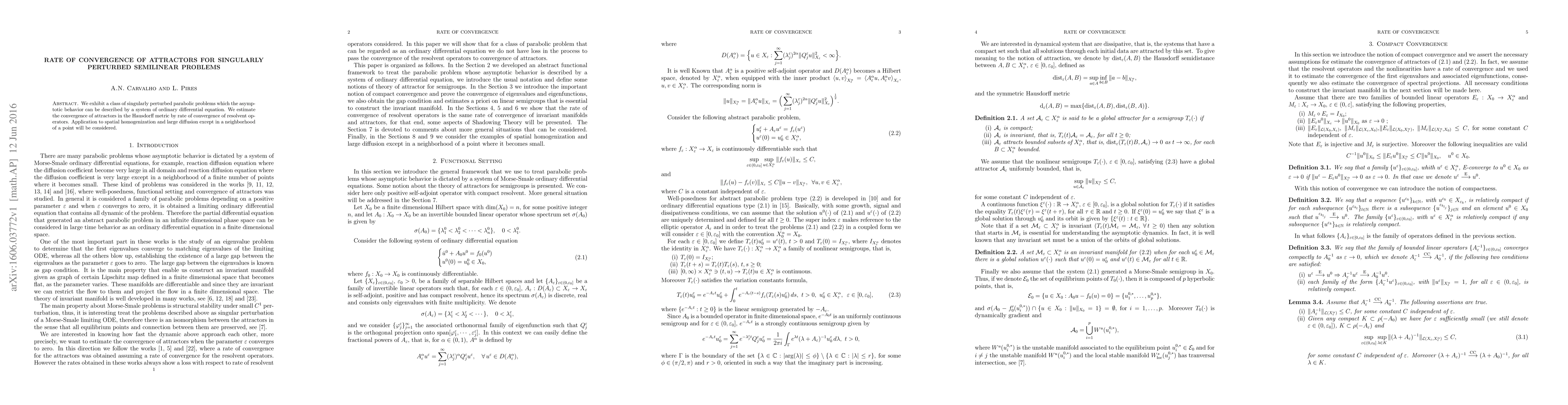This paper investigates the rate of convergence of attractors for singularly perturbed parabolic problems, showing that their asymptotic behavior can be described by a system of ordinary differential equations. The convergence rate is estimated through the rate of convergence of resolvent operators, with applications to spatial homogenization and large diffusion scenarios.