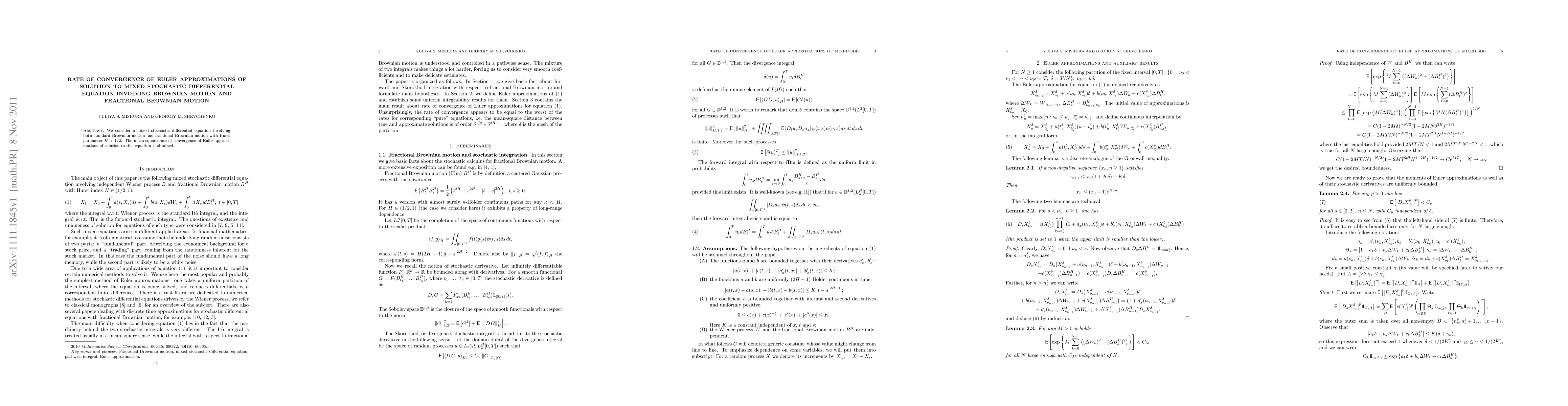 We consider a mixed stochastic differential equation involving both standard Brownian motion and fractional Brownian motion with Hurst parameter $H>1/2$. The mean-square rate of convergence of Euler approximations of solution to this equation is obtained.