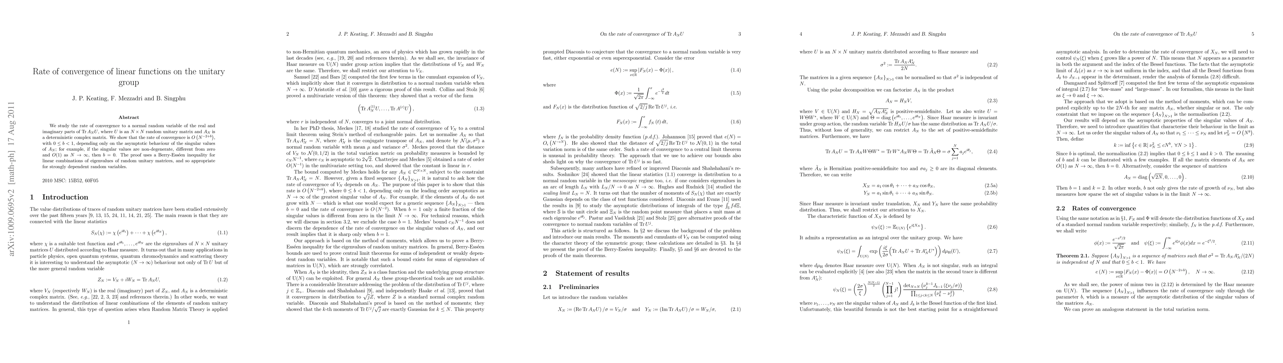 The paper studies how fast complex functions of random unitary matrices converge to normal distributions, finding a rate of convergence that depends on the asymptotic behavior of the singular values of the input matrix.