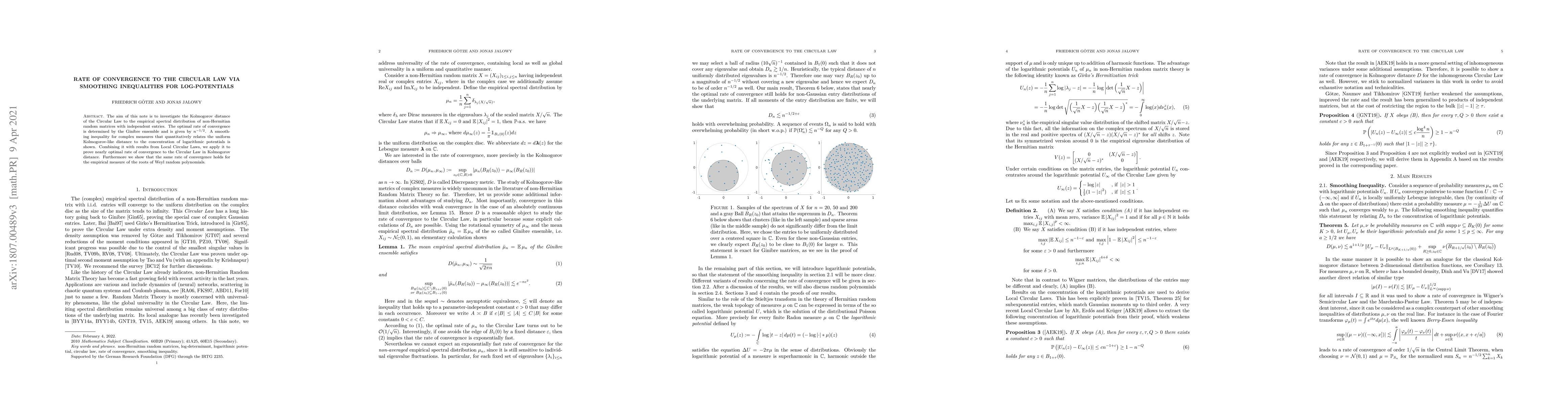 This paper examines the convergence rate to the Circular Law for non-Hermitian random matrices, achieving nearly optimal convergence at $n^{-1/2}$ via smoothing inequalities for log-potentials. It also extends the findings to the empirical measure of Weyl random polynomials.