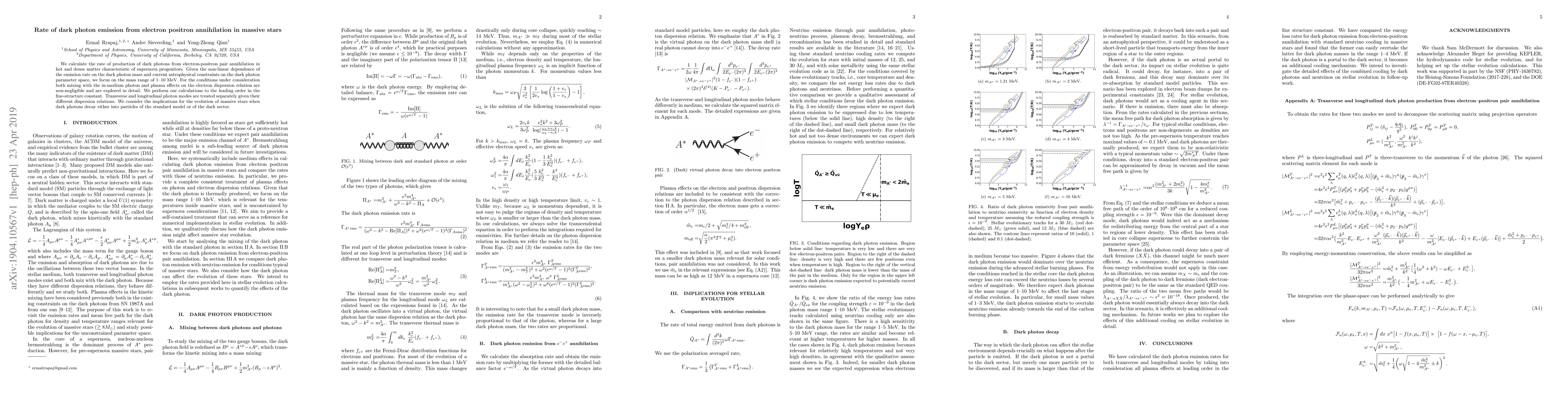We calculate the rate of production of dark photons from electron-positron pair annihilation in hot and dense matter characteristic of supernova progenitors. Given the non-linear dependence of the emission rate on the dark photon mass and current astrophysical constraints on the dark photon parameter space, we focus on the mass range of 1--10 MeV. For the conditions under consideration both mixing with the in-medium photon and plasma effects on the electron dispersion relation are non-negligible and are explored in detail. We perform our calculations to the leading order in the fine-structure constant. Transverse and longitudinal photon modes are treated separately given their different dispersion relations. We consider the implications for the evolution of massive stars when dark photons decay either into particles of the standard model or of the dark sector.