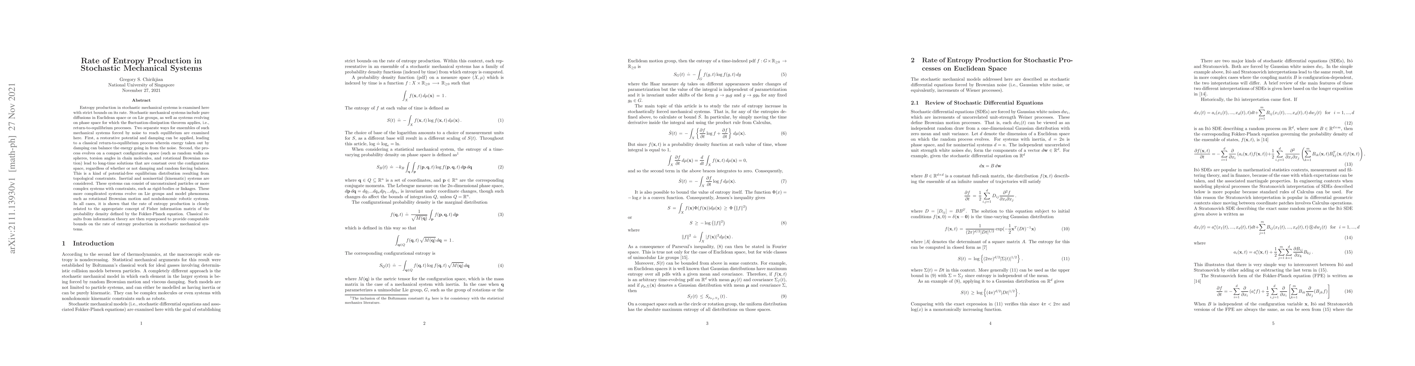 This paper examines entropy production rates in stochastic mechanical systems, including diffusions and systems governed by the fluctuation-dissipation theorem. It explores two pathways to equilibrium: one involving restorative potential and damping, and another based on topological constraints. The study establishes bounds on the rate of entropy production using Fisher information matrix concepts derived from the Fokker-Planck equation.