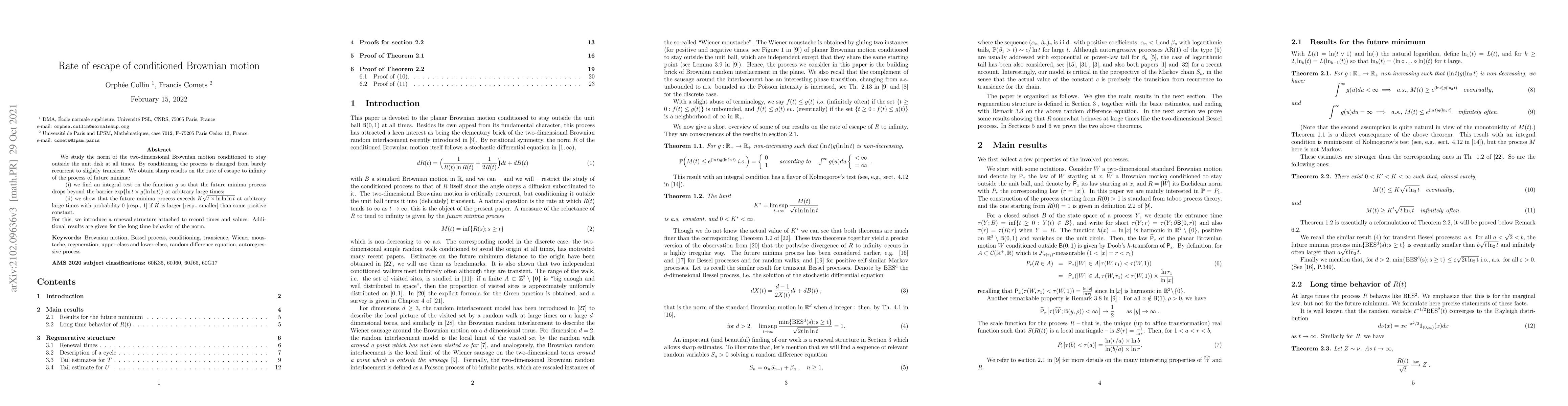 We study the norm of the two-dimensional Brownian motion conditioned to stay outside the unit disk at all times. By conditioning the process is changed from barely recurrent to slightly transient. We obtain sharp results on the rate of escape to infinity of the process of future minima: (i) we find an integral test on the function $g$ so that the future minima process drops beyond the barrier $\exp \{ \ln t \times g(\ln \ln t)\}$ at arbitrary large times; (ii) we show that the future minima process exceeds $K \sqrt{ t \times \ln \ln \ln t}$ at arbitrary large times with probability 0 [resp., 1] if $K$ is larger [resp., smaller] than some positive constant. For this, we introduce a renewal structure attached to record times and values. Additional results are given for the long time behavior of the norm.