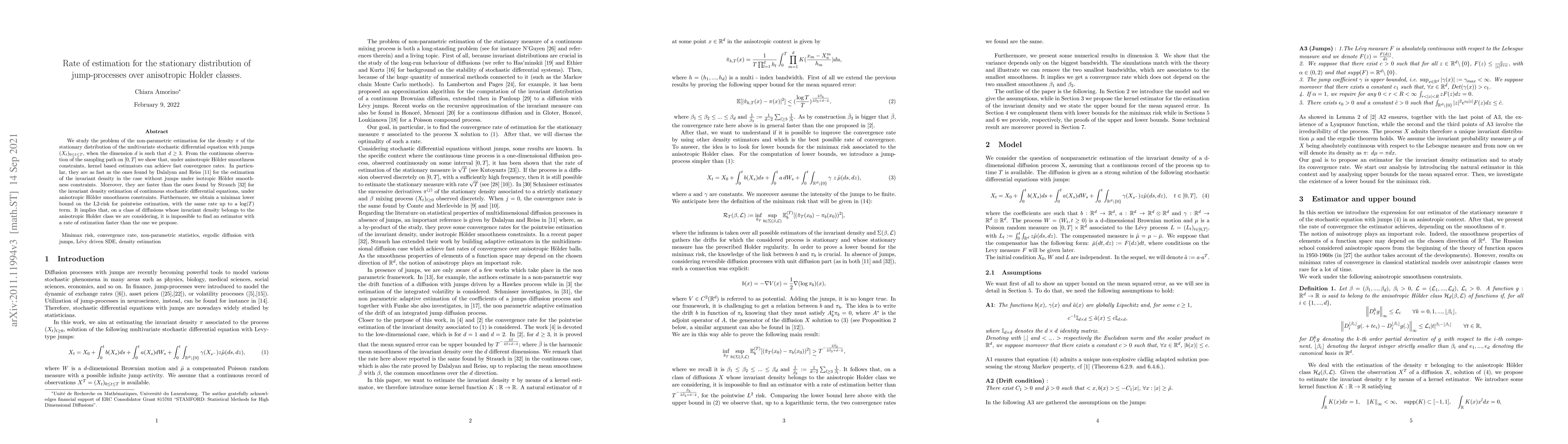 This paper investigates non-parametric estimation for the stationary distribution of multivariate stochastic differential equations with jumps, demonstrating that kernel-based estimators achieve fast convergence rates under anisotropic Holder smoothness constraints. The proposed estimators match the convergence rates of those for continuous processes without jumps and outperform existing methods for continuous stochastic differential equations.