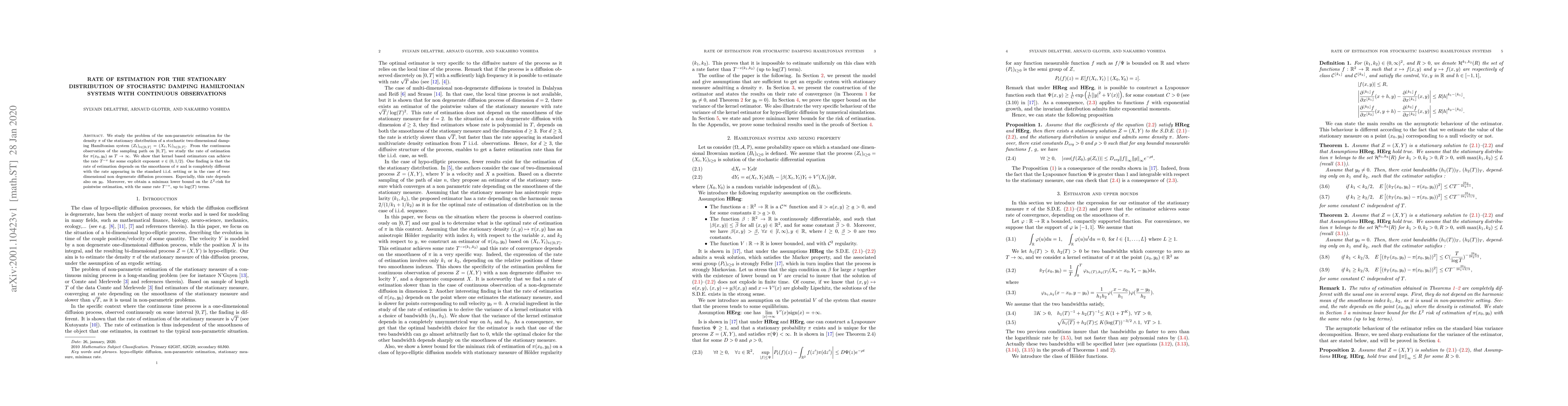 This paper investigates the non-parametric estimation of the stationary distribution for a stochastic damping Hamiltonian system with continuous observations. It demonstrates that kernel-based estimators achieve a rate of $T^{-v}$ for estimating $\pi(x_0,y_0)$, with $v \in (0,1/2)$, showing that this rate depends on the smoothness of $\pi$ and varies with $y_0$, differing from standard i.i.d. settings.