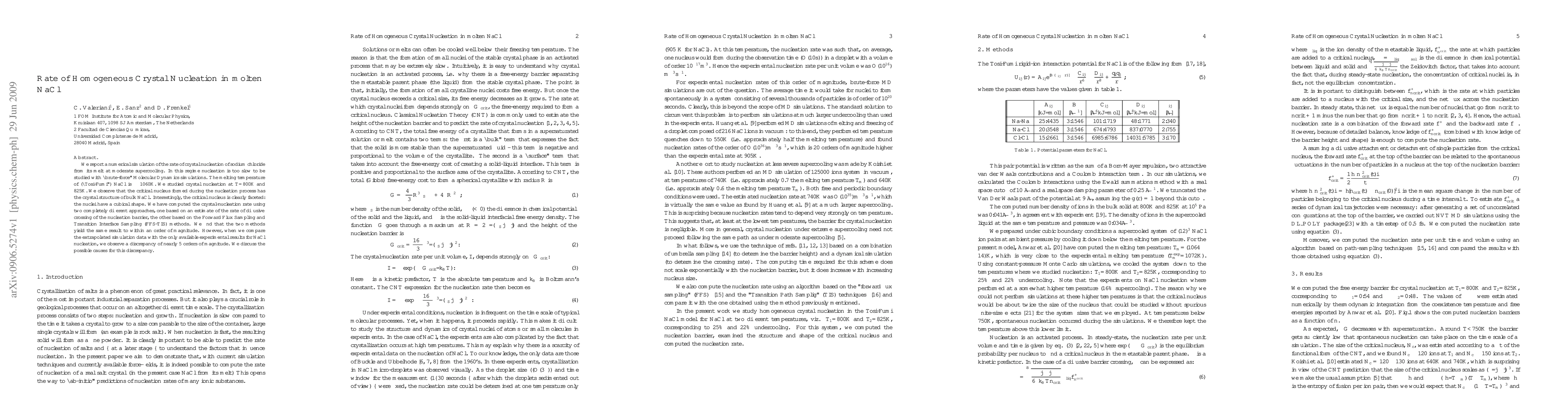 This paper reports a numerical simulation of sodium chloride crystal nucleation from its melt at moderate supercooling, finding faceted cubical critical nuclei and comparing two computational methods yielding similar nucleation rates. However, the simulation results differ significantly from experimental data by nearly 5 orders of magnitude, prompting discussion on potential causes for the discrepancy.
