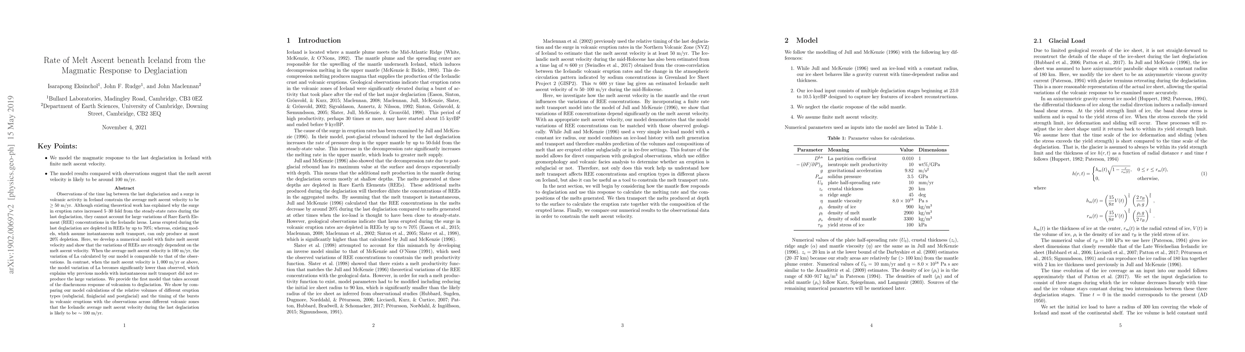 This study models the melt ascent velocity beneath Iceland during deglaciation, finding it to be around 100 m/yr. The model, incorporating finite melt ascent velocity, explains the observed large variations in Rare Earth Element (REE) concentrations in Icelandic lavas, which previous models couldn't account for.