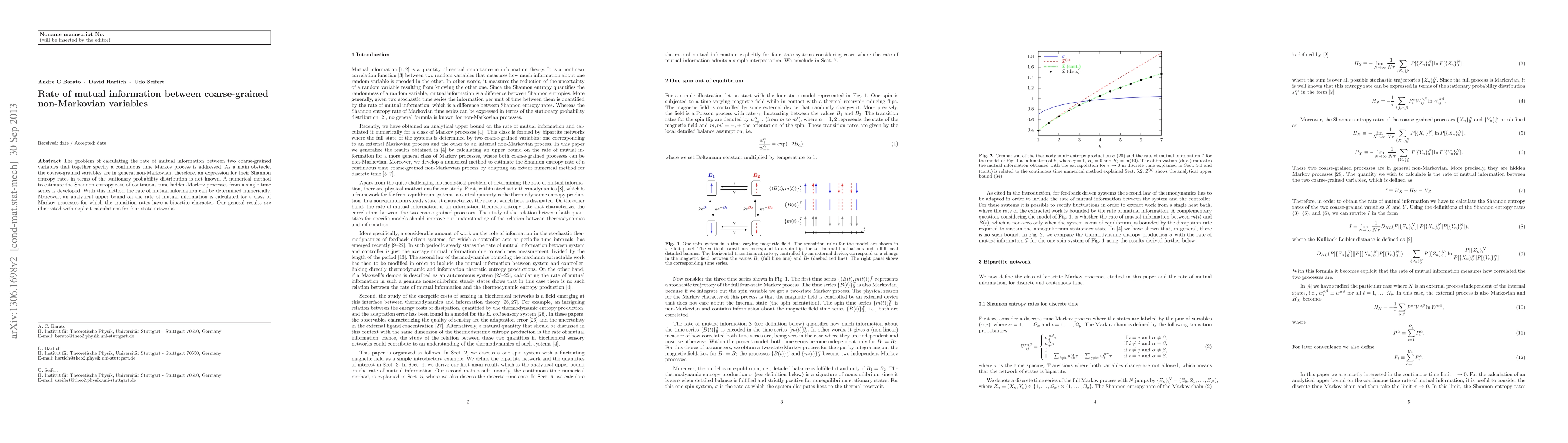 The problem of calculating the rate of mutual information between two coarse-grained variables that together specify a continuous time Markov process is addressed. As a main obstacle, the coarse-grained variables are in general non-Markovian, therefore, an expression for their Shannon entropy rates in terms of the stationary probability distribution is not known. A numerical method to estimate the Shannon entropy rate of continuous time hidden-Markov processes from a single time series is developed. With this method the rate of mutual information can be determined numerically. Moreover, an analytical upper bound on the rate of mutual information is calculated for a class of Markov processes for which the transition rates have a bipartite character. Our general results are illustrated with explicit calculations for four-state networks.