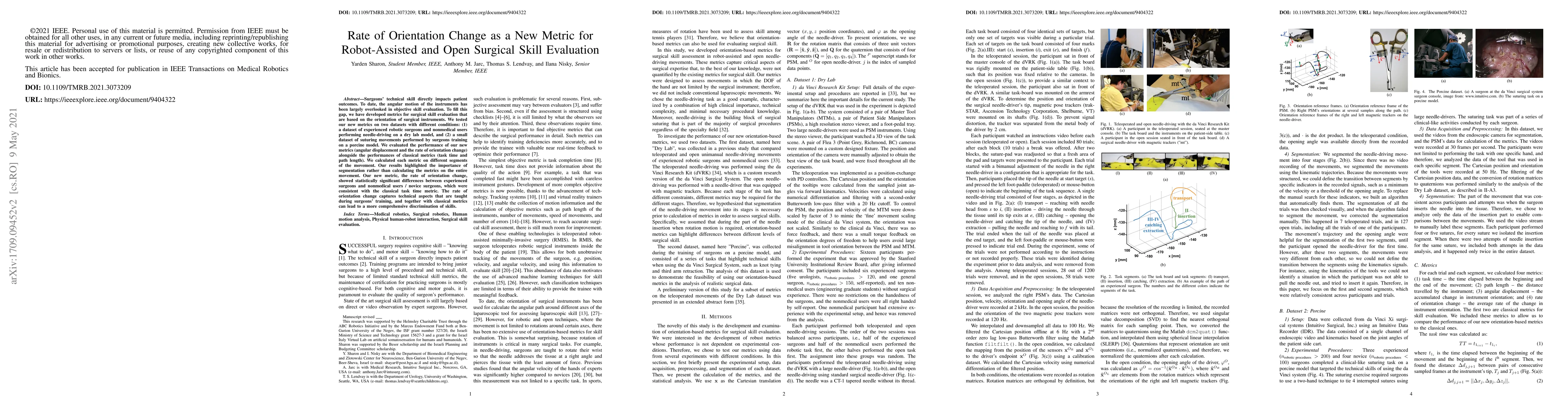 This paper introduces a new metric, the rate of orientation change, for evaluating surgical skill based on the angular motion of instruments, demonstrating its effectiveness in distinguishing experienced surgeons from novices. The study shows that this metric, when used alongside traditional measures like task time, provides a more comprehensive assessment of surgical proficiency.
