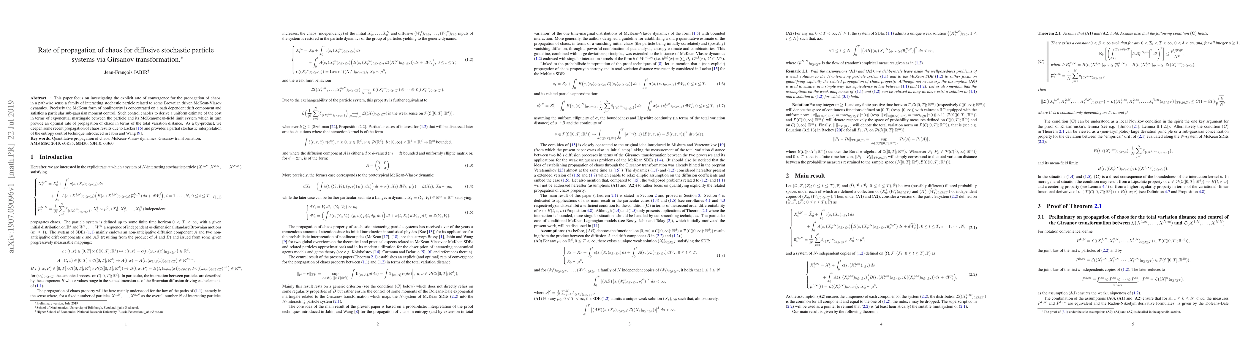 This paper investigates the explicit rate of convergence for the propagation of chaos in diffusive stochastic particle systems, deriving a uniform estimate using Girsanov transformation and sub-Gaussian moment control, and providing an optimal rate in total variation distance. It also extends recent propagation of chaos results and offers a stochastic interpretation of entropy control techniques.