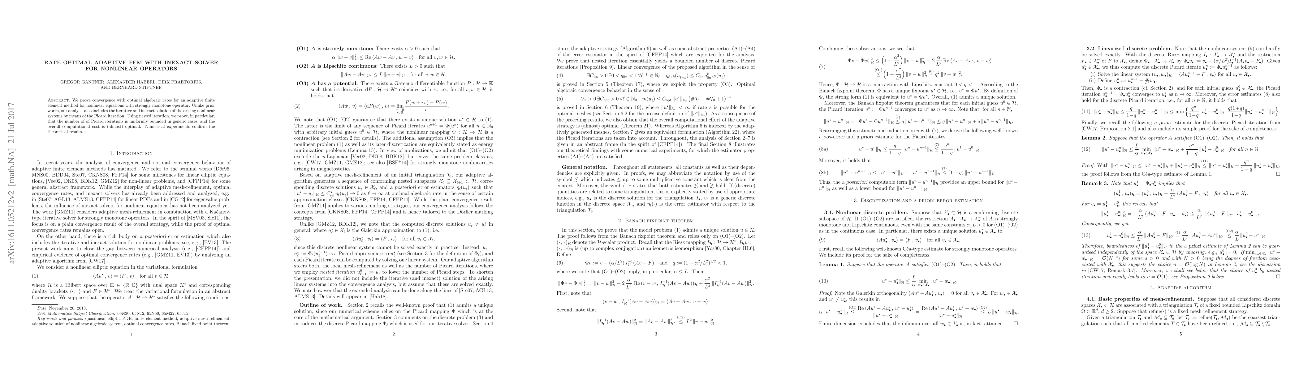 This paper presents an adaptive finite element method for solving nonlinear equations with strongly monotone operators, demonstrating optimal convergence rates. It introduces an inexact solver via Picard iteration, proving bounded iterations and near-optimal computational cost, validated by numerical experiments.