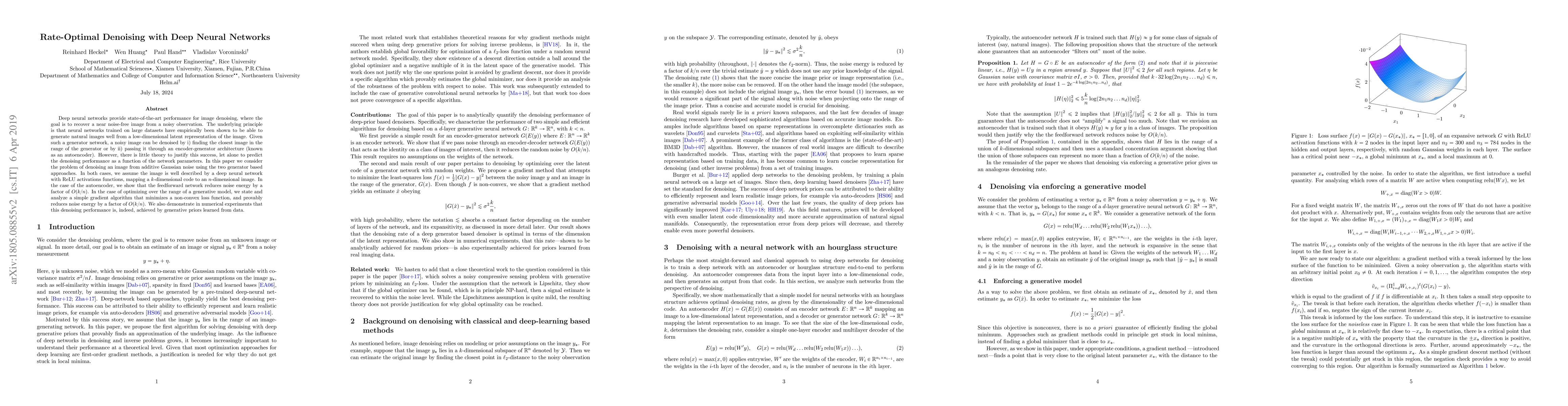Deep neural networks provide state-of-the-art performance for image denoising, where the goal is to recover a near noise-free image from a noisy observation. The underlying principle is that neural networks trained on large datasets have empirically been shown to be able to generate natural images well from a low-dimensional latent representation of the image. Given such a generator network, a noisy image can be denoised by i) finding the closest image in the range of the generator or by ii) passing it through an encoder-generator architecture (known as an autoencoder). However, there is little theory to justify this success, let alone to predict the denoising performance as a function of the network parameters. In this paper we consider the problem of denoising an image from additive Gaussian noise using the two generator based approaches. In both cases, we assume the image is well described by a deep neural network with ReLU activations functions, mapping a $k$-dimensional code to an $n$-dimensional image. In the case of the autoencoder, we show that the feedforward network reduces noise energy by a factor of $O(k/n)$. In the case of optimizing over the range of a generative model, we state and analyze a simple gradient algorithm that minimizes a non-convex loss function, and provably reduces noise energy by a factor of $O(k/n)$. We also demonstrate in numerical experiments that this denoising performance is, indeed, achieved by generative priors learned from data.