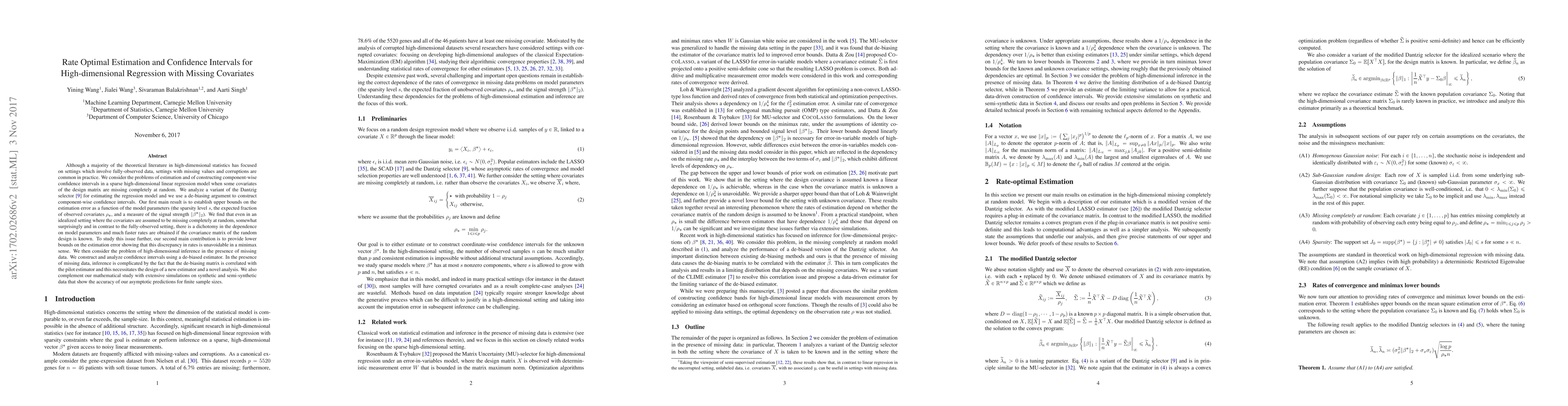 This paper investigates estimation and confidence interval construction for high-dimensional linear regression models with missing covariates. It proposes a variant of the Dantzig selector and a de-biasing method to address these challenges, demonstrating faster estimation rates when the covariance matrix is known. The study also establishes lower bounds to show the unavoidable discrepancy in rates due to missing data.